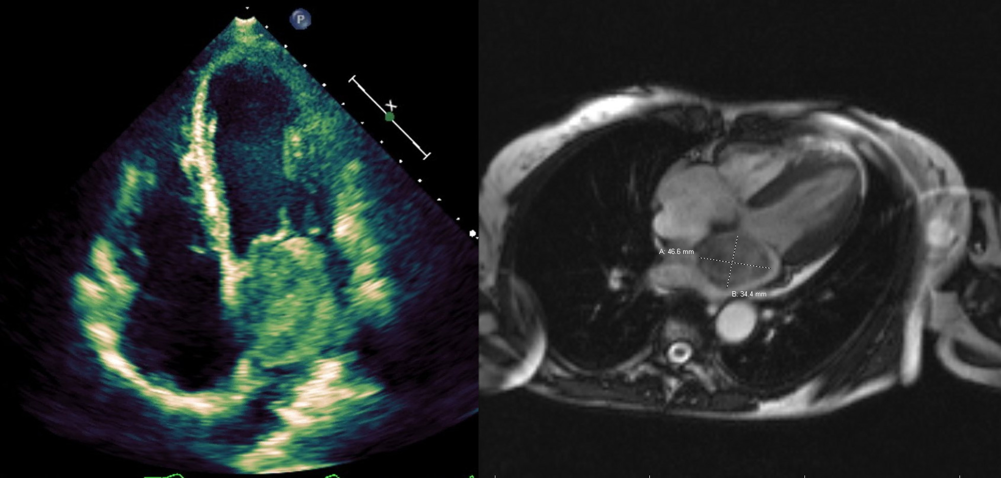 Case Presentation: A 76 year-old African American female with no past medical history presented with new onset shortness of breath and substernal chest pressure of three week duration. She noted that she had been previously healthy without any issues prior to this incident. On presentation, the patient was afebrile and normotensive (125/76) but tachycardic (110 beats per minute) and tachypneic (24 breaths per minute). Physical exam revealed a patient in mild distress along with 1+ pitting edema and mild jugular venous distention (12 cm H2O). Significant labs included mildly elevated troponin (0.06) and BNP (314). All other labs including chemistries, complete blood counts, thyroid panel, and urine drug screen were negative. Chest x-ray showed mild bilateral pulmonary congestion and EKG revealed mild tachycardia and left atrial enlargement, but no ST or T segment abnormalities. The patient was admitted for new onset acute heart failure exacerbation and started on IV diuresis.
