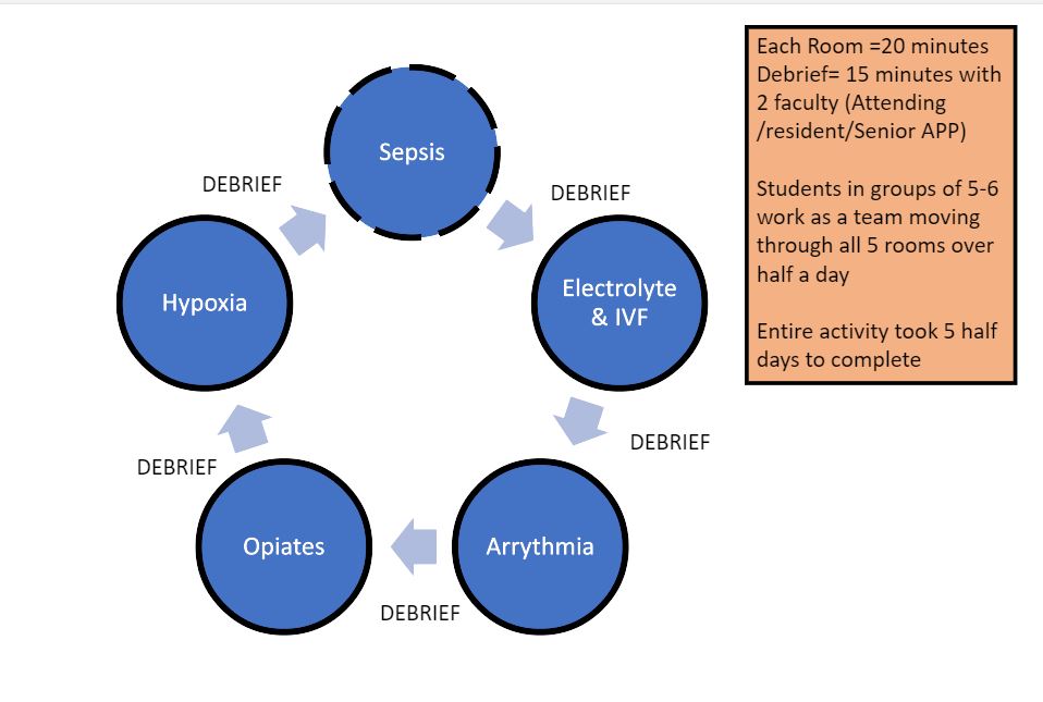 Description: A total of 243 graduating 4th year medical students in teams of 5 worked their way sequentially across five in-person escape rooms (at the simulation center)–sepsis, electrolyte and acid base, arrhythmia, pain management and hypoxia. Simulation best practices were followed with a common prebrief followed by room activities and debrief after each room. We used a varying combination of props and puzzles and two facilitators were present per room. Students completed a pre and post Likert-scale questionnaire rating their comfort in managing the clinical conditions covered in this session. Additionally, they completed an activity evaluation with a comment section for strengths and areas for improvement. Results: Over a two-year period, 243 4th-year medical students participated in the session. 220 students (90.5%) completed the pre activity survey and 216 (88.8%) completed the post survey. About 95% of students either agreed or strongly agreed that the escape room format was conducive to learning, helped prepare them for their intern year and helped build teamwork skills. Students’ changes in comfort level in managing the clinical topics were assessed using Wilcoxon signed rank test. Comfort levels for all topics improved significantly (p <.001).
