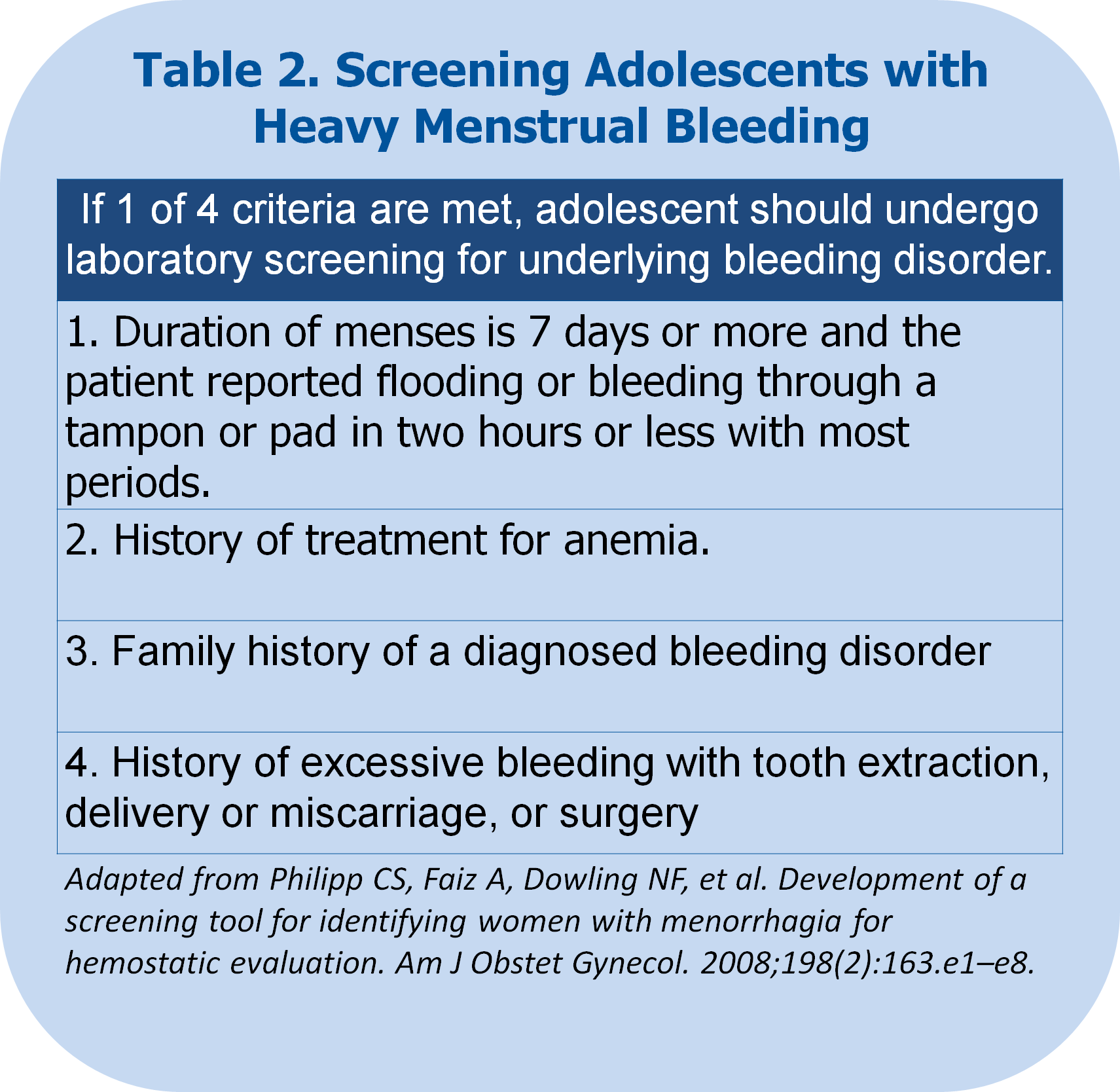 Discussion: Adolescents with heavy menstrual bleeding should have a thorough history to assess risk of bleeding disorder. If patients screen positive for having excessive menstrual bleeding (defined as lasting greater than or equal to seven days and bleeding through a tampon or pad in 2 hours or less), a history of treatment for anemia, a family history of a diagnosed bleeding disorder, or a history of excessive bleeding with procedures or surgery, then the coagulation studies should be performed (Table 2). An elevated INR and PTT that does not correct with mixing studies, is indicative of an inhibitor being present, and should raise concern for a lupus anticoagulant. In patients with heavy menstrual bleeding, oral contraceptive pills are typically the first line treatment. However, patients with lupus anticoagulant are at increased risk of thrombosis, which can be increased further by combined oral contraceptives with estrogen. In this case, the patient was prescribed progestin-only contraceptives to treat her menstrual bleeding to minimize risk of thrombosis.