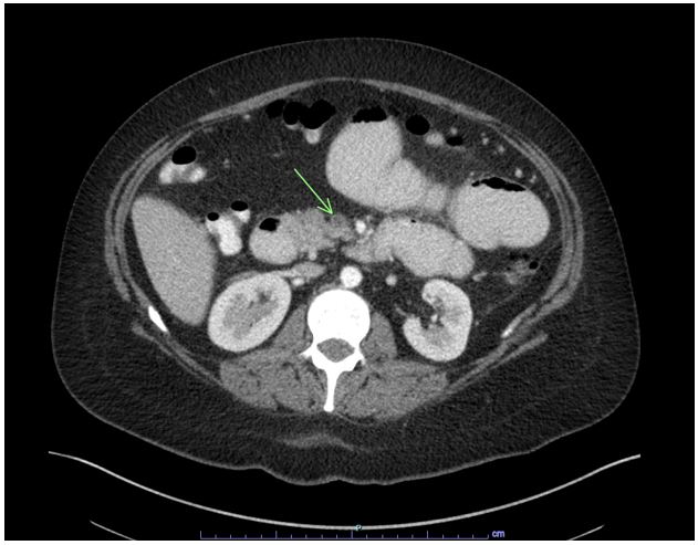 Case Presentation: A 33 year-old female presented to an outside facility with a few days of gradual onset abdominal pain with nausea and vomiting. On presentation, vital signs were notable for tachycardia. Examination showed periumbilical tenderness without rigidity or guarding. Labs were remarkable for leukocytosis and normocytic anemia but normal lipase. CT of the abdomen and pelvis showed small bowel wall thickening with minimal ground-glass changes in the mesentery suggestive of enteritis.