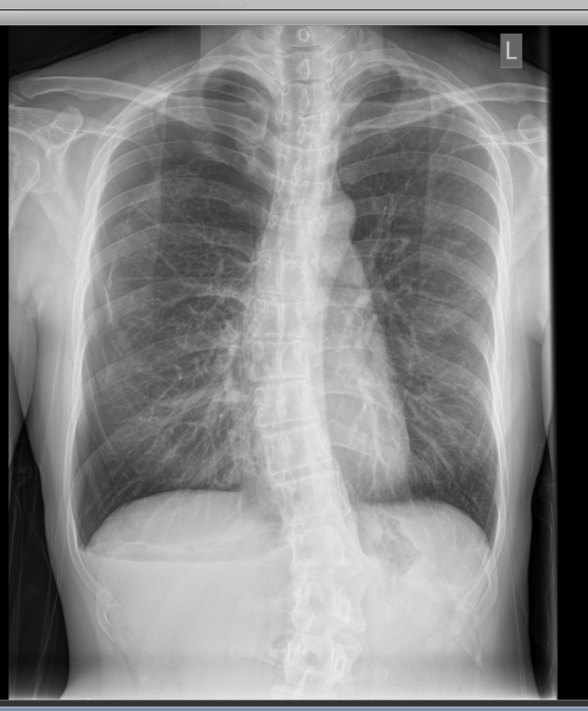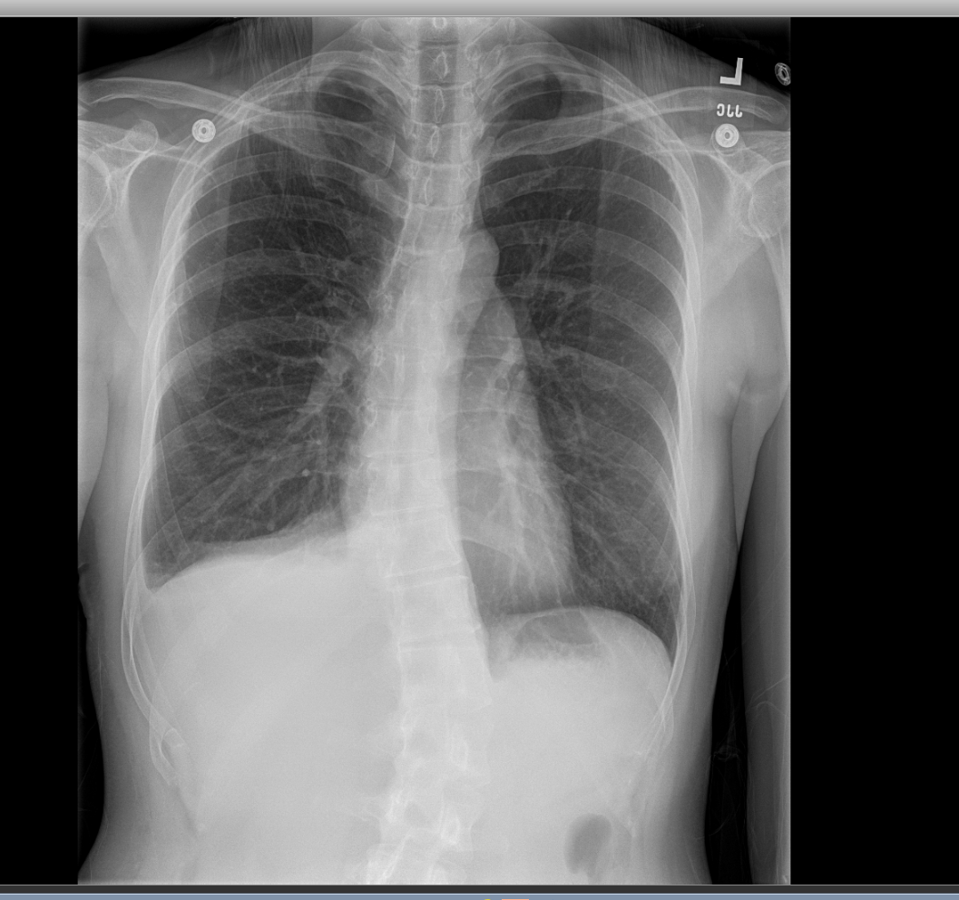 Discussion: We describe a case of catamenial pneumothorax presenting outside the recognized 72-96 hour perimenstrual window. The classical definition of catamenial pneumothorax is the recurrence of air in the pleural cavity in reproductive-age women without lung disease. Diagnostic Criteria include: appearance within 72 hours before or after the start of monthly menses, characteristic pleural lesions, right-sided, and concomitant endometriosis (2). Approximately 3-6% of cases of spontaneous pneumothorax can be attributed to catamenial pneumothorax. Our patient presented approximately 2 weeks after her last menstrual period, which is unusual. There have been a few reports of cases presenting up to 7 days before and after the start of menstrual flow (2,3) but incidence outside this time period is exceedingly rare. The pathogenesis of catamenial pneumothorax is still not well understood. Many mechanisms have been proposed: Increased prostaglandin F2 causing blood vessel constriction and bronchospasms, migration of endometrial cells producing diaphragmatic defects, lymphovascular microembolism with pleural defects, and diaphragmatic air passage (2,3). Treatment includes hormonal therapy +/- VATS.