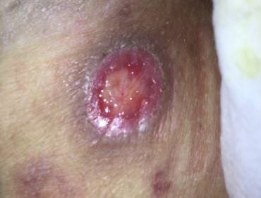 Case Presentation: A 63 year old female with a past medical history significant for rheumatoid arthritis, COPD, hypertension, hypothyroidism who was admitted with the chief complaint of a rash. It was present for two months and was predominantly distributed on the extremities and gluteal region. It was painful and at times even pruritic. There were sores in her mouth for weeks with anorexia and weight loss due to odynophagia (to solids and liquids). Also endorsed low grade fevers at home upto 100.2°F. Apart from that she had acute diarrhea with occasional hematochezia (which she attributed to hemorrhoids). Therapy with methotrexate and folic acid was initiated approximately 9 years ago and had never encountered any side effects or lab abnormalities. Last dose of methotrexate was a week prior to hospitalization. She did report a recent hospitalization for renal failure approximately two months ago. On examination there were crusted/ulcerated appearing necrotic macular lesions on bilateral upper extremities. There were necrotic ulcers seen on the tips of the fingers and on right great toe. Ulcerated necrotic macules in the gluteal region and posterior aspect of right thigh also seen. Large erosions were seen on the bilateral buccal mucosa, the palate and the lip and oral thrush. Labs showed pancytopenia (white cell count: 1.95 x 109/L, red blood cell count: 2.78 1012/L, platelet count: 101 x 109/L) with neutropenia as well. Macrocytosis was noted and methotrexate level was slightly elevated at 0.06 mcmol/L. A skin biopsy revealed changes consistent with methotrexate induced dermal necrosis. Treatment was initiated with intravenous folic acid and leucovorin following which the pancytopenia resolved and no new skin lesions appeared.