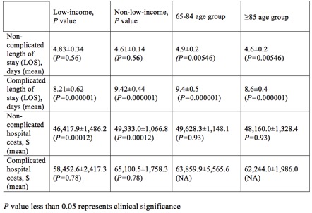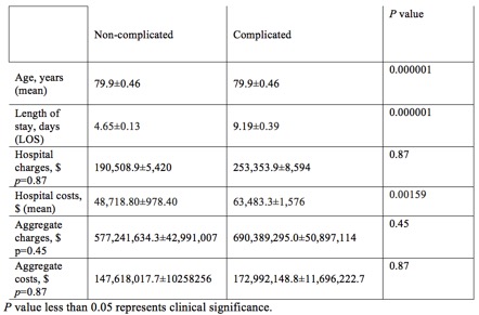 Results: Of 5755 patients, 2724 (47.4%) were found to have associated procedural complications. We found that those with complications were slightly older than those without (mean age of 79.9±0.46 vs. 79.8±0.58, p value=0.000001). The presence of complications was also associated with an increased length of hospital stay (9.19±0.39 days vs. 4.65±0.13 days, p value=0.000001). Hospital costs also appeared to be increased in the group that developed complications compared to the non-complication group ($63,483.3±1,576 USD vs. $48,718.80±978.40, p value=0.00159). Differences in hospital charges, aggregate charges or aggregate costs were not statistically significant. When evaluating the complication group by economic sub-groups, we found that the low-income population had a shorter length of stay compared to the higher-income population (8.211±0.62 days vs 9.43±0.423 days, p value=0.000001). In the non-complication group, we did not find any significant length of stay difference in low-income vs higher-income sub-groups (4.83±0.34 days vs 4.61±0.14 days, p value=0.555). Low-income patients were also associated with lower hospital costs per admission compared to higher-income patients in the non-complication group ($46,417±1,486 USD vs. $49,332±1,066 USD, p value=0.00012). Finally, length of stay appeared to be longer in younger patients than older among patients with procedural complications (9.38±0.52 days in 65-84 year olds vs. 8.59±0.44 days in those ages ≥85, p value=0.000001).