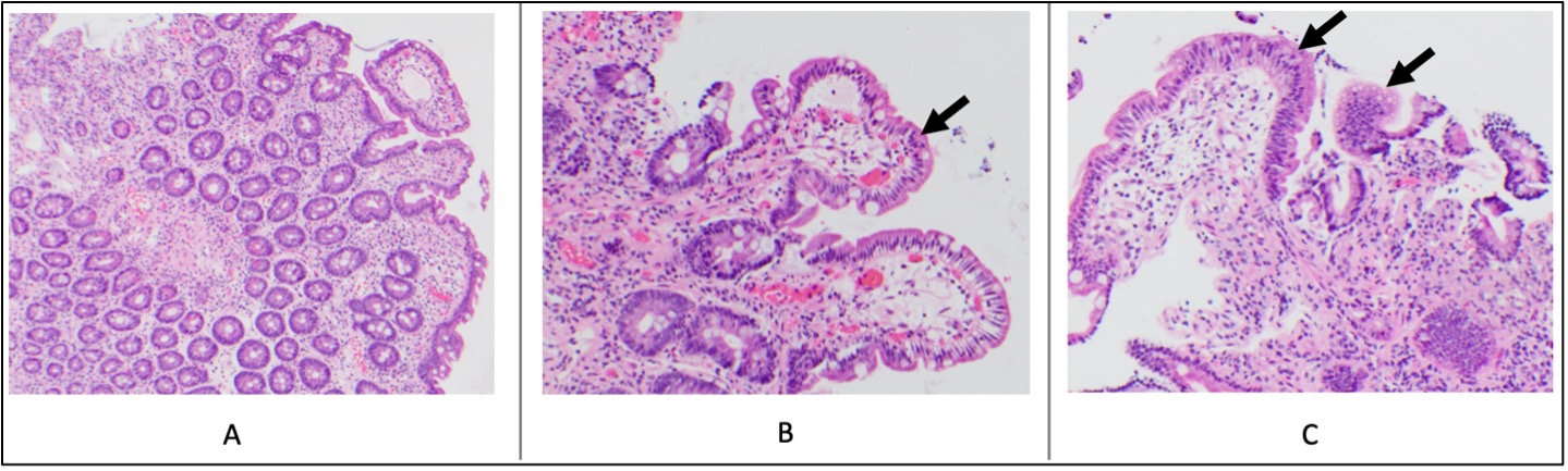 Case Presentation: A 66-year-old female with pan-hypogammaglobulinemia from therapies for stage IV diffuse large B-cell lymphoma (DLBCL) and psoriatic arthritis on aprimelast presented with 6 months of severe diarrhea and hypokalemia. She achieved complete remission of DLBCL with R-CHOP and CAR-T therapy 15 and 8 months before symptom onset, respectively. Severe pan-hypogammaglobulinemia was detected 3 months prior to symptoms.She developed watery, non-bloody, non-mucoid diarrhea 6 months before presentation, experiencing up to 30 episodes daily. After 3 months of symptoms, she sought evaluation. Labs showed hypokalemia (1.9 mmol/L; reference range [RR] 3.4-4.8 mmol/L), leading to hospitalization. Diagnostics revealed stool osmotic gap consistent with secretory diarrhea; gastrointestinal pathogen panel (GIPP) positive for norovirus; negative stool Clostridium difficile assay, ova and parasite panel, calprotectin, adenovirus, and CMV PCR; negative serum anti-tissue transglutaminase, celiac disease associated HLA alleles DQ2 / DQ8, and HIV antigen/antibody; normal serum thyroid stimulating hormone; low serum IgG (147 mg/dL; RR 646-2013 mg/dL), IgM (< 8 mg/dL; RR 40-230 mg/dl), IgA (< 15 mg/dL; RR 70-400 mg/dL), and IgE (< 2 IU/mL; RR 2-214 IU/mL). Colonoscopy revealed pan-colonic congested mucosa with minimal microscopic neutrophilic colitis. Esophagogastroduodenoscopy was grossly normal; duodenal biopsies showed patchy mild-to-moderate villous blunting, focal foveolar metaplasia, and minimally increased intraepithelial lymphocytes (Figure 1). Intravenous immunoglobulin (IVIG) improved symptoms for one day, but they returned, prompting a 5-days of nitazoxanide with colestipol, potassium supplementation, and anti-diarrheals. She improved and discharged with potassium supplementation. One month later, she was re-admitted with hypokalemia and worsened diarrhea. Labs showed pan-hypogammaglobulinemia and a GIPP positive for norovirusShe was diagnosed with chronic norovirus infection. Treatment included IVIG, nitazoxanide, and anti-diarrheal. With ongoing symptoms, enteral immunoglobulin was initiated. Diarrhea slowed and potassium normalized by discharge. One year later, she continues with biweekly IVIG infusions.