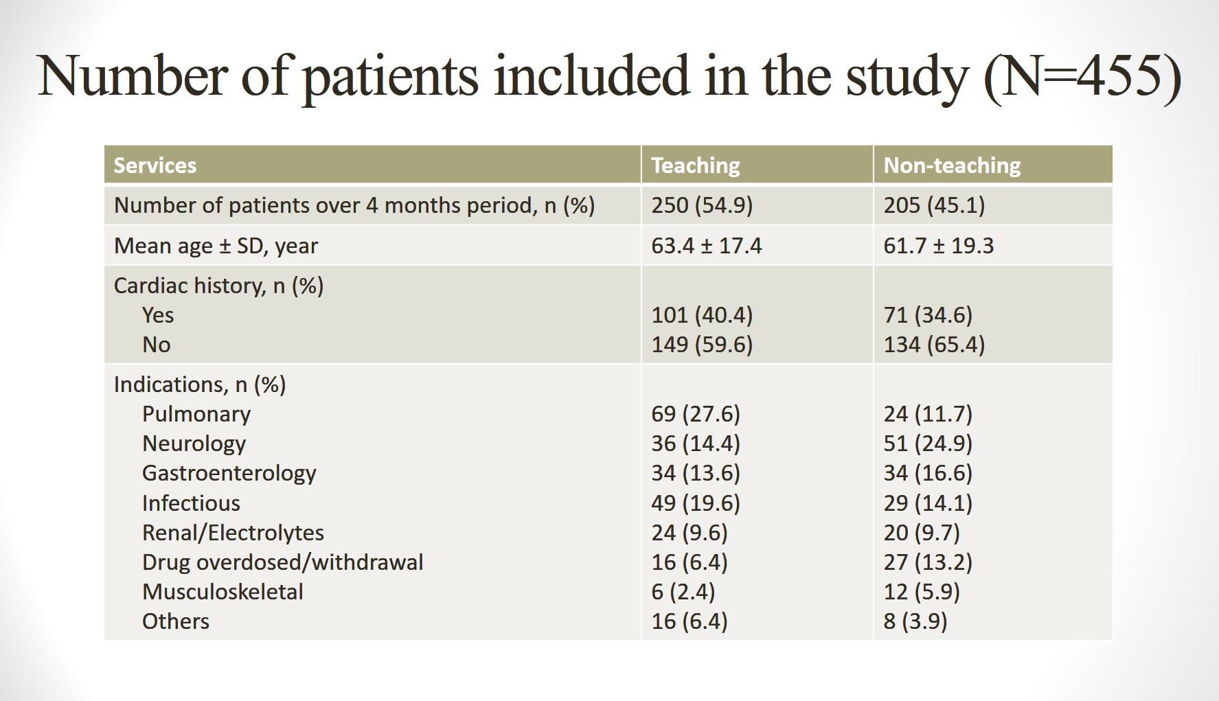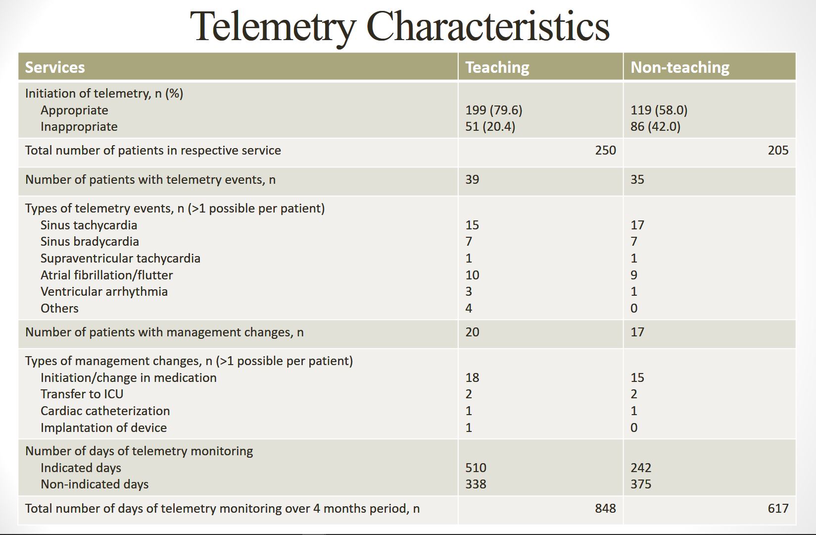 Results: Out of 735 patients, 455 patients were admitted to telemetry bed for non-cardiac related diagnoses over 4 months period. 30.1% (137/455) had inappropriate initiation of telemetry monitoring. Majority of them, 62.2% (283/455), had no known cardiac history. Clinically significant arrhythmias occurred in 16.3% (74/455) of the monitored patients, with only 8.1% (37/455) had management changes related to the telemetry events. Overall, the total number of patient days of telemetry monitoring over 4 consecutive months was 1465. On subgroup analysis by service, teaching service: 510 (60.1%) indicated days and 338 (39.9%) non-indicated days, whereas non-teaching service: 242 (39.2%) indicated days and 375 (60.8%) non-indicated days. No death event was reported in the non-indicated days. The estimated cost difference between telemetry ($7533) and medicine-surgery ($4727) bed per patient per night at our hospital was $7533 – $4727 = $2806. This was translated to a total waste of $2806 x 338 = $948,428 (teaching service) vs $2806 x 375 = $1,052,250 (non-teaching service) in non-indicated days over the 4 months period.