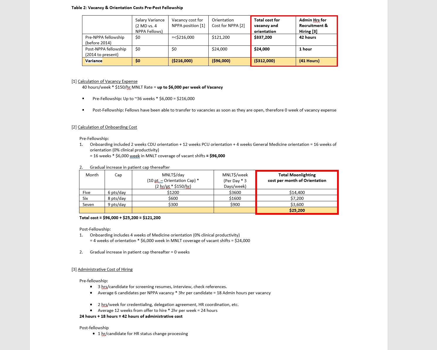 Description: Staffing vacancies on our hospitalist service are expensive; patient volumes must be covered regardless, so costly moonlighting is incurred. However, hospitalist NP/PA vacancies were going unfilled for 9 months or more, and new NP/PA hires could take up to 18 months to work independently. The reasons for these delays were multifactorial (Table 1). In 2014, a one-year NP/PA fellowship was established. Four fellows are accepted each year and are eligible for hire as hospitalist NP/PAs after training. The fellowship is comprised of 20% didactic instruction and 80% clinical rotations in the inpatient setting which consist of NP/PA fellows evaluating and managing patients in one-on-one MD:NP/PA Fellow dyads. Physician salary for 2.0 FTEs on our service is the equivalent of four NP/PA fellows’ salaries; so by converting, through attrition, two physician FTEs into four NP/PA fellows the salary expense was kept cost neutral. Downsizing by 2.0 physician FTEs did resulted in a lost census capacity of 10 patients per weekday. However, each of the four MD:NP/PA Fellow dyads see 3 patients more per day than a solo-physician (4*3=12 patients); allowing the service to see 3 more patients per day post-fellowship than pre-fellowship. There were also cost-savings realized in recruitment and orientation. The total cost of a single NP/PA vacancy, prior to the fellowship, was as much as $335,000; the cost of a vacancy post-fellowship has been a maximum of $24,000 (Table 2).
