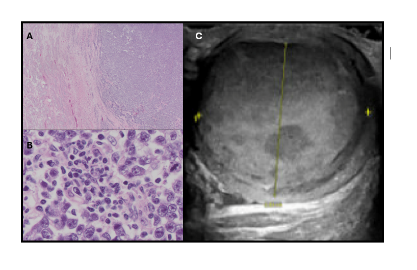 Discussion: The differential of a testicular mass in this case included recurrent T-ALL versus a primary testis malignancy. T-ALL is rare, given the incidence in the US is 3 cases per million per year. Patients present with cervical, axillary or mediastinal masses (4). “Low” versus “high” risk categories exist depending on certain mutations (7). CNS involvement is common and usually takes the form of leptomeningeal disease (7). In addition to CNS involvement, the testes are also recognized as a sanctuary site in ALL, with testicular relapses reported during or after treatment in B-ALL and rarely in T-ALL (8). Converse to the rarity of isolated testicular T-ALL relapse, testicular cancer is the most common solid malignancy affecting males from 15 to 35 years of age (3). It most commonly presents with a painless or painful testis mass. The diagnostic evaluation includes testicular ultrasound, tumor markers and radical orchiectomy (8, 9). Negative tumor markers do not rule out the diagnosis. Testicular biopsy is contraindicated due to risk of tumor seeding (9). Testicular cancer is highly curable, particularly early-stage seminoma, associated with > 99% 5-year survival following orchiectomy alone (3). Given high cure rates, effective salvage therapy and long-term toxicities associated with additional therapy, the NCCN generally recommends surveillance for Stage I seminoma without additional adjuvant therapy (5, 6).