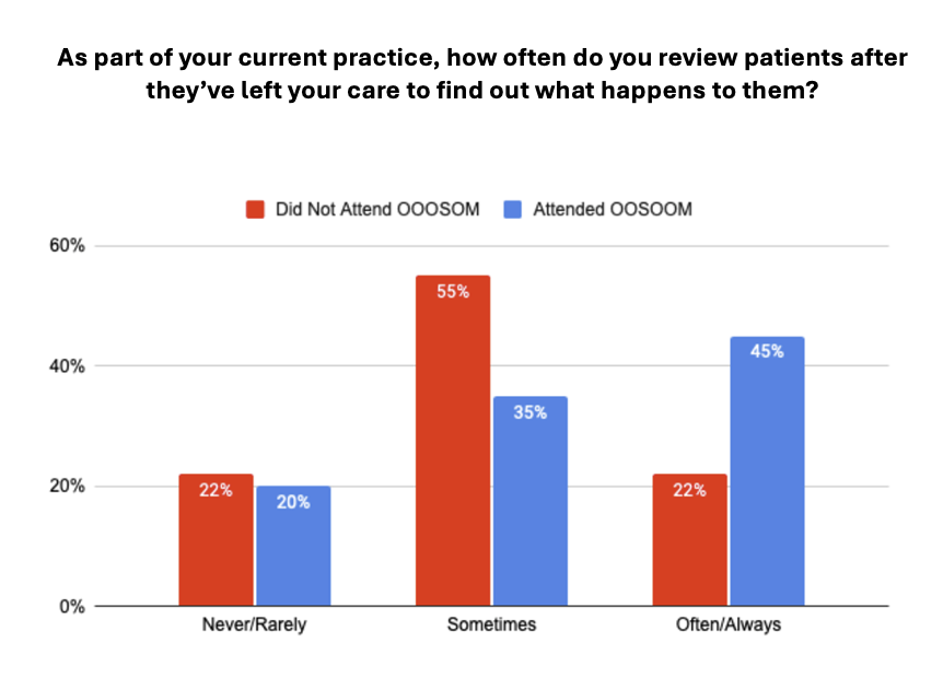 Description: We created an easy-to-implement, resident-led conference to review post-hospitalization outcomes. Residents are given lists of patients that they discharged in the previous six months and select one case to present at an OOSOOM conference. Four residents present their cases at each conference. Each presenter reviews five to ten patients who have post-hospitalization outcome data available in the EMR. We encourage them to gather additional information by calling patients. They are asked to pay special attention to patients whose post-hospitalization course differs from the team’s expectations at the time of discharge. Each resident creates a presentation using de-identified patient information, and we coach them to describe lessons they learned and changes they would make in their future practice. We studied the effect of OOSOOM by administering a retrospective pre/post survey immediately following the first four conferences and a follow-up outcome survey two to four years after participation in OOSOOM. Prior to OOSOOM, only 8% of residents reported reviewing their patients’ post-hospitalization progress “often” or “always.” After the conference, 41% of residents said they would “probably” or “definitely” review their patients’ outcomes. In the follow-up outcome survey, of the residents who had attended at least one OOSOOM conference during residency, 45% reported reviewing patients after they leave their care “often” or “always” as part of their current practice compared to 22% of residents who had not attended an OOSOOM conference. These results suggest that there may be practice-changing value in such conferences.The format of OOSOOM achieves the dual goals of giving residents an opportunity to reflect on their practice and cultivating the habit of auditing post-hospitalization outcomes. OOSOOM also identifies opportunities for quality improvement projects and builds medical knowledge via experiential learning. Unlike a traditional Morbidity & Mortality (M&M) conference, in OOSOOM, residents are not limited to presenting negative outcomes and cases where care was suboptimal. Many choose to focus on diagnostic feedback, resulting in discussions more conducive to learning. In addition, unlike a traditional M&M, the outcomes residents discuss are often only uncovered by their review of post-hospitalization records rather than being reported in a quality or mortality review. Having this freedom allows residents to direct their own learning and influence their colleagues, thus advancing the overall goal of inspiring lifelong learning.