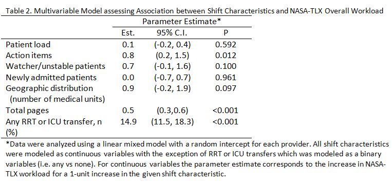 Methods: Overnight providers completed the NASA-TLX at the end of each night shift. Numerous night shift characteristics were collected including patient census, assigned action items, watcher/unstable patients, newly admitted patients, geographic distribution, total pages, peak pager density, rapid response team (RRT) activation, and ICU transfer. Multivariable analysis was performed to determine which shift characteristics correlated with higher raw mean NASA-TLX scores.