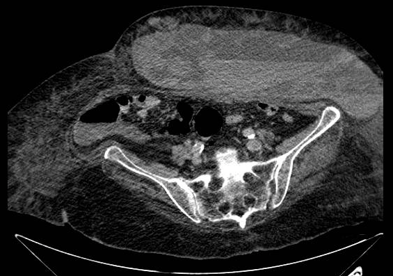 Case Presentation: An 88-year-old female with hypertension was admitted to the hospital due a to right tibiofibular fracture and underwent an open reduction internal fixation (ORIF). During admission, she was diagnosed with heart failure with preserved ejection fraction (>55%) and non-valvular atrial fibrillation with CHA2DS2-VASc score 5. She was started on therapeutic anticoagulation therapy for cardioembolic event prevention with enoxaparin 60 mg subcutaneously every 12 hours. One day during rounds, the patient began complaining of new, worsening left‐sided abdominal pain at the enoxaparin injection site associated with drowsiness, diaphoresis and fatigue. Physical examination and laboratories were remarkable for tachycardia, hypotension, a distended abdomen with generalized tenderness and a left upper quadrant area of induration and bruising associated with a hemoglobin drop from 9.3 g/dL to 5.4 g/dL. A diagnosis of hypovolemic shock was made and patient was resuscitated with intravenous fluids, packed red blood cells, and vasopressors. Abdominopelvic CT scan with contrast showed a large subcutaneous mixed density hematoma (2.9 cm x 7.6 cm x 10 cm) at the lower abdominopelvic wall with a hyperdense punctate focus within the hematoma suggestive of active bleeding. There was no identifiable source of bleeding and the left epigastric artery showed a normal course and caliber without evidence of extravasation of contrast to the hematoma. The patient was stabilized and transferred to intensive care unit for further hemodynamic support and close monitoring. Interventional Radiology and General Surgery services were consulted for acute management, but despite aggressive measures, the patient died of progressive bleeding during her ICU stay.