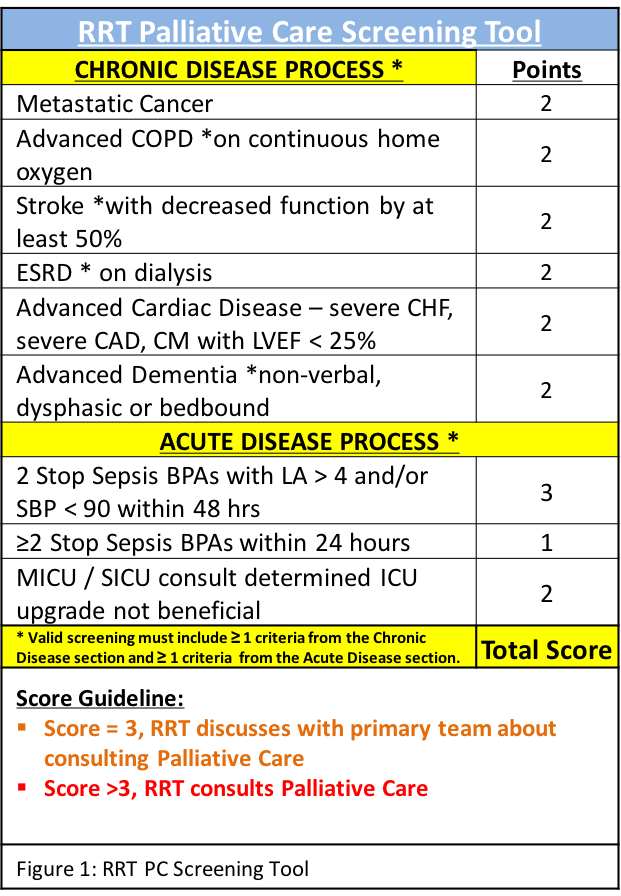 Background: Palliative care (PC) has been shown to be cost-effective and improve the quality of life for patients facing incurable and life-threatening illness. However, identifying patients benefiting from PC consultation remains a challenge in the inpatient setting. As part of a quality improvement initiative, we created a PC screening tool by adapting elements from existing outpatient tools to the inpatient setting. The 9-item PC tool aims to help guide PC consultation by identifying inpatients who would benefit from PC services. The tool has been incorporated into our hospital’s Rapid Response Team (RRT) work flow, where a PC score ≥ 4 triggers an automated consult to the palliative care service and a PC score of 3 prompts the RRT to recommend palliative care consultation to the primary team. The purpose of this project is to assess whether this PC tool accurately predicts patients who are at increased risk for mortality and would thus benefit from PC consultation.