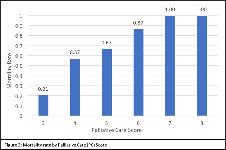 Results: Between April 2016 and May 2017, 161 patients were assigned PC scores ≥ 3 by the RRT screeners. Of these patients, 95 were retrospectively confirmed by the trained study staff to have met criteria of having at least one chronic and one acute item on the PC tool. The overall mortality for this group was 56.8%. Higher PC scores corresponded to increased mortality with mortality rates reaching 100% with PC scores >6 (chi-square for trend, p<0.001) (Figure 2).