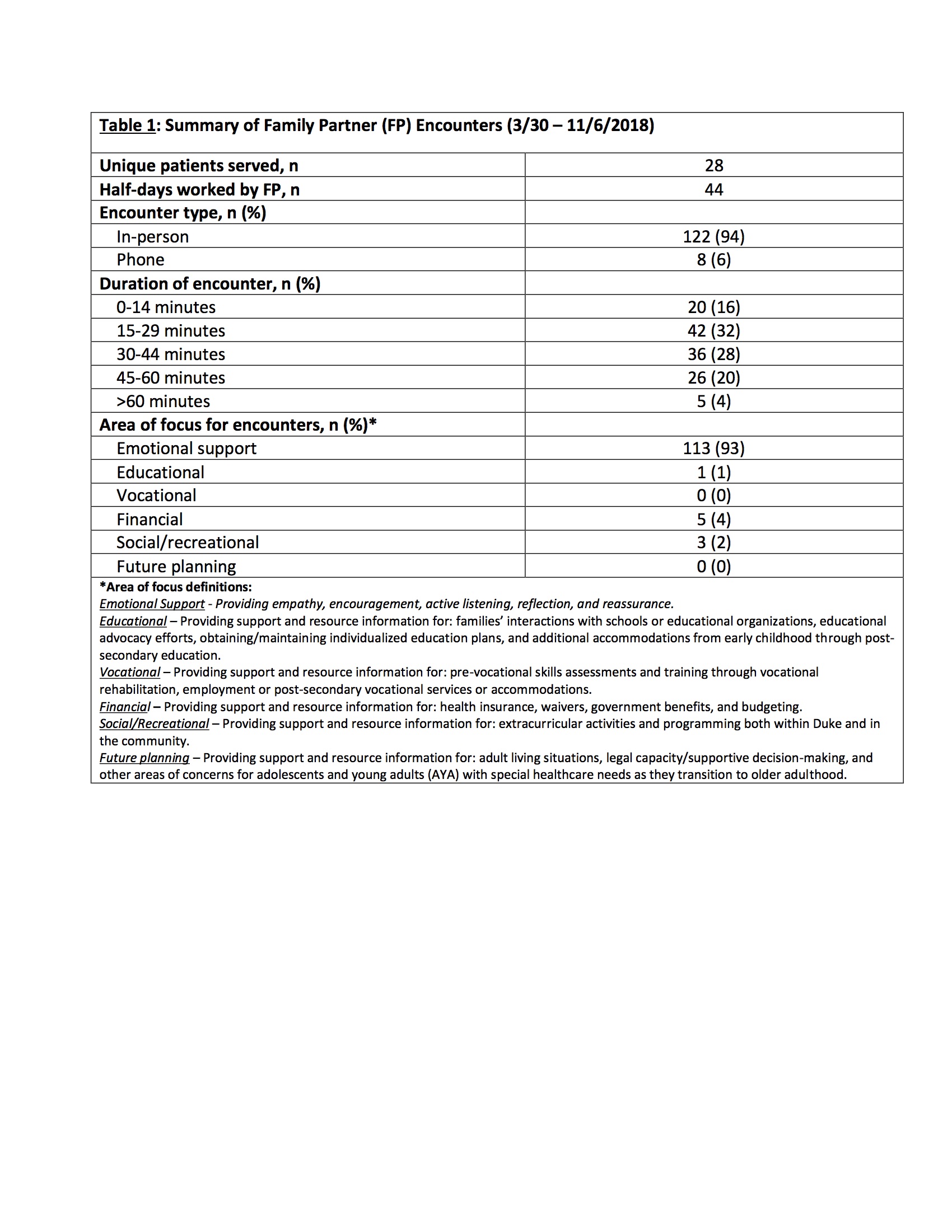 Description: The purpose of the CCS FP was to provide enhanced support and information to parents of CMC hospitalized at Duke. The FP role was recently developed at Duke as a patient/family-centered team member who can serve as a bridge between outpatient pediatric clinicians and the patient/parent experience. We adapted the CCS FP pilot from these local experiences. One parent of a CMC who last received care from the Duke CCS program two years prior was hired and completed formal training in parent navigation and health coaching. The CCS FP received central supervision and support from four other FPs based in outpatient child psychiatry and pediatric primary care clinics at Duke; the CCS FP was the first inpatient-based FP at Duke. The CCS FP was available to meet with parents in the hospital two afternoons/week. We categorized CCS FP-parent encounters into core focus areas (Table 1). In six months (3/30 – 11/6/18), the CCS FP conducted 130 encounters with parents of 28 patients (average 4.6 encounters/patient). Most encounters were in-person (94%), focused on emotional support (93%), and lasted over 30 minutes per encounter (52%). Encounter details are described in Table 1.