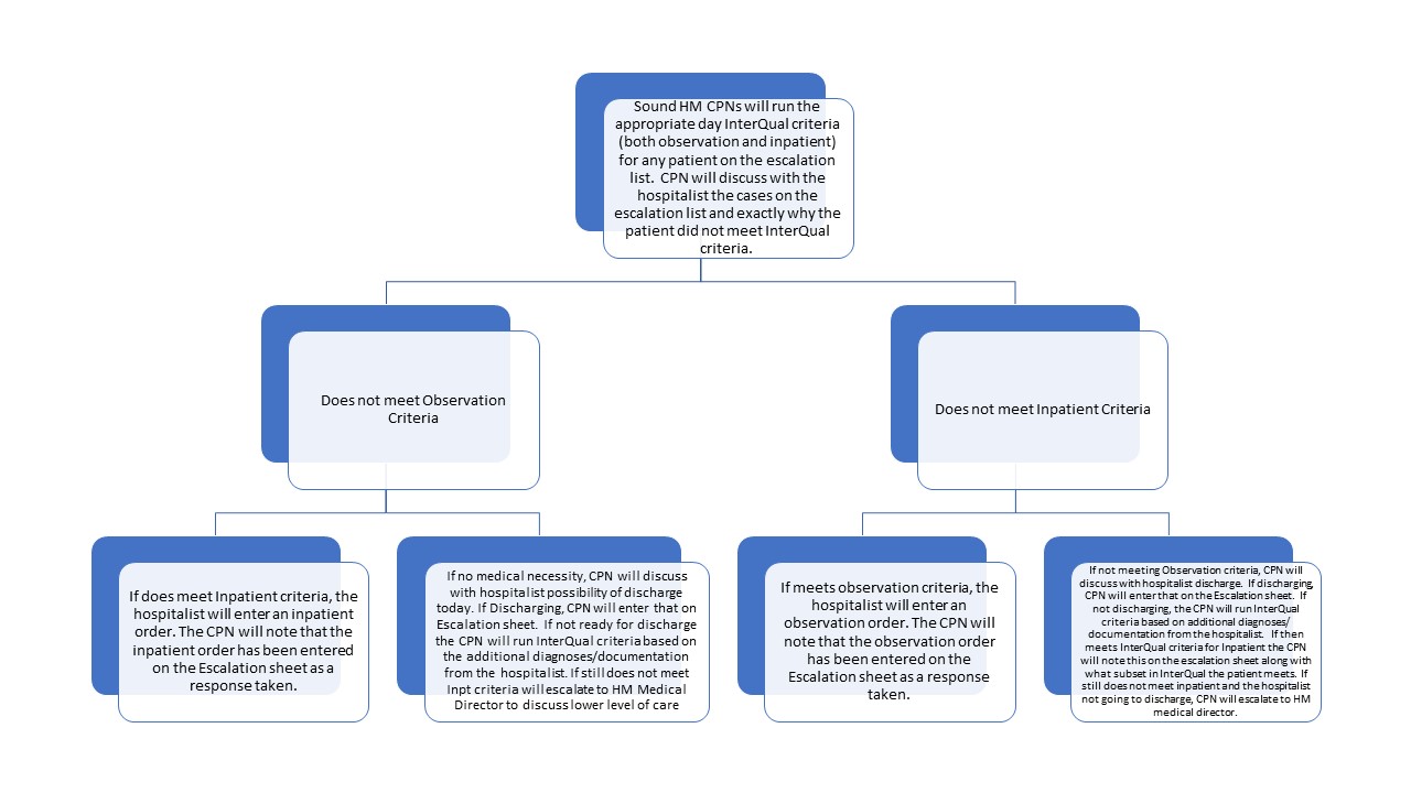 Description: Sound Advisory began with educating and staffing nurses to do remote InterQual Initial Reviews after making training videos and handouts on the process. The ER clerk sent a Tiger Text message to the hospitalist and Sound Advisory nurse with the name of the ER patient to be admitted. The hospitalist would write the admission order based on the InterQual Initial Review recommendation with the caveat for the Medicare FFS anticipated length of stay. Through the billing software for the hospitalists, we were able to automate a report for all Medicare FFS patients who were in observation status. After 1 midnight our nurses would screen to determine if the patient was staying a second midnight in the hospital. For these patients, the Sound PAs would review the EMR to determine if inpatient status was appropriate. If the patient was appropriate for inpatient level of care, the PA would communicate directly with the hospitalist and request the inpatient order.