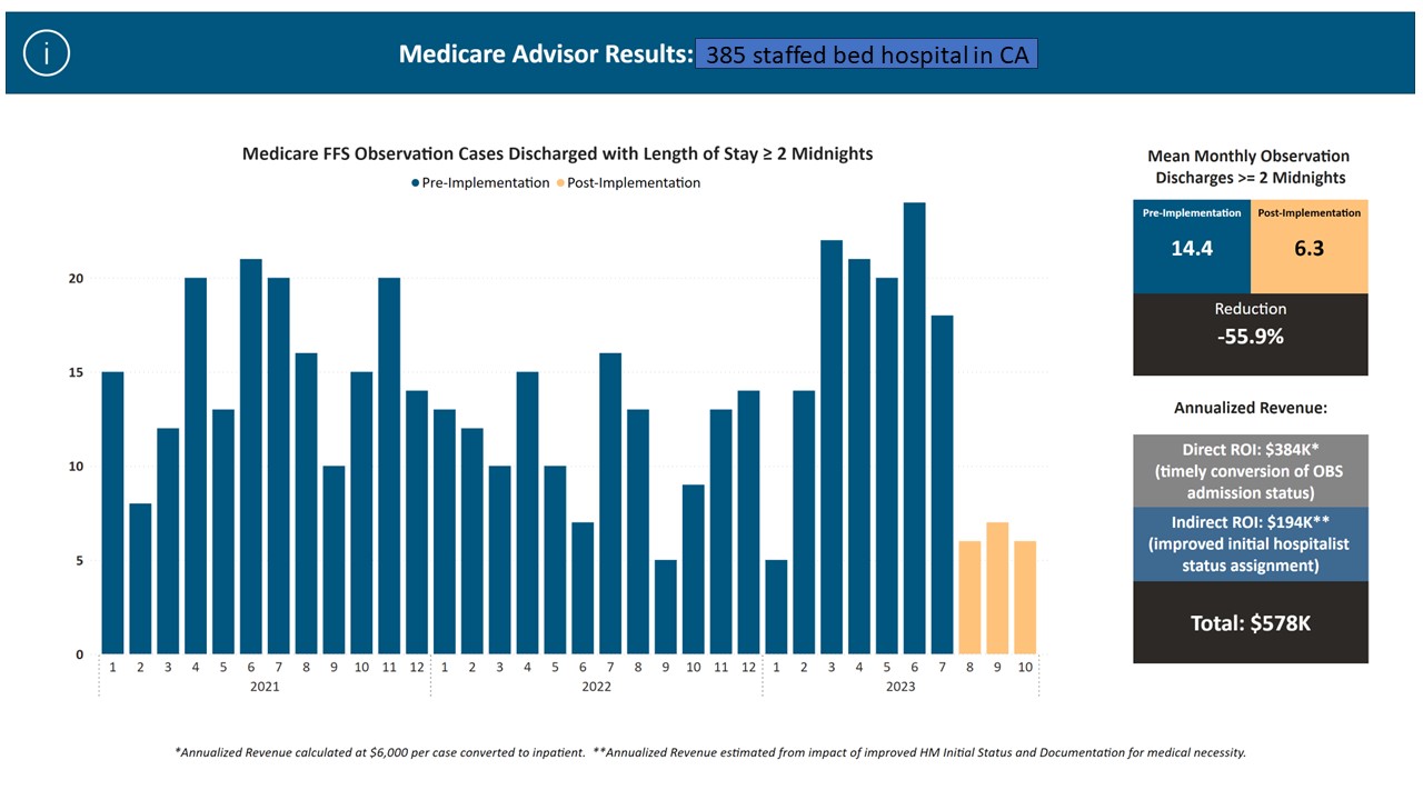 Conclusions: After Sound Advisory implemented the process, the number of patients not meeting day 1 InterQual level of care went down significantly. Sound Advisory tracked the number of patients who met for inpatient, observation, and no level of care. This process can be used for feedback for the ER and HM providers. This helps to ensure that no ER provider has excessive admissions for patients without medical necessity. The rate of Medicare 2-midnights or longer observation stays went from 14.4 per month to 6.3 per month. This results in an approximately $578,000 annual revenue increase for the hospital as the hospital is reimbursed approximately $2300 for an observation stay and the hospital is reimbursed approximately $8300 for the average medical DRG.