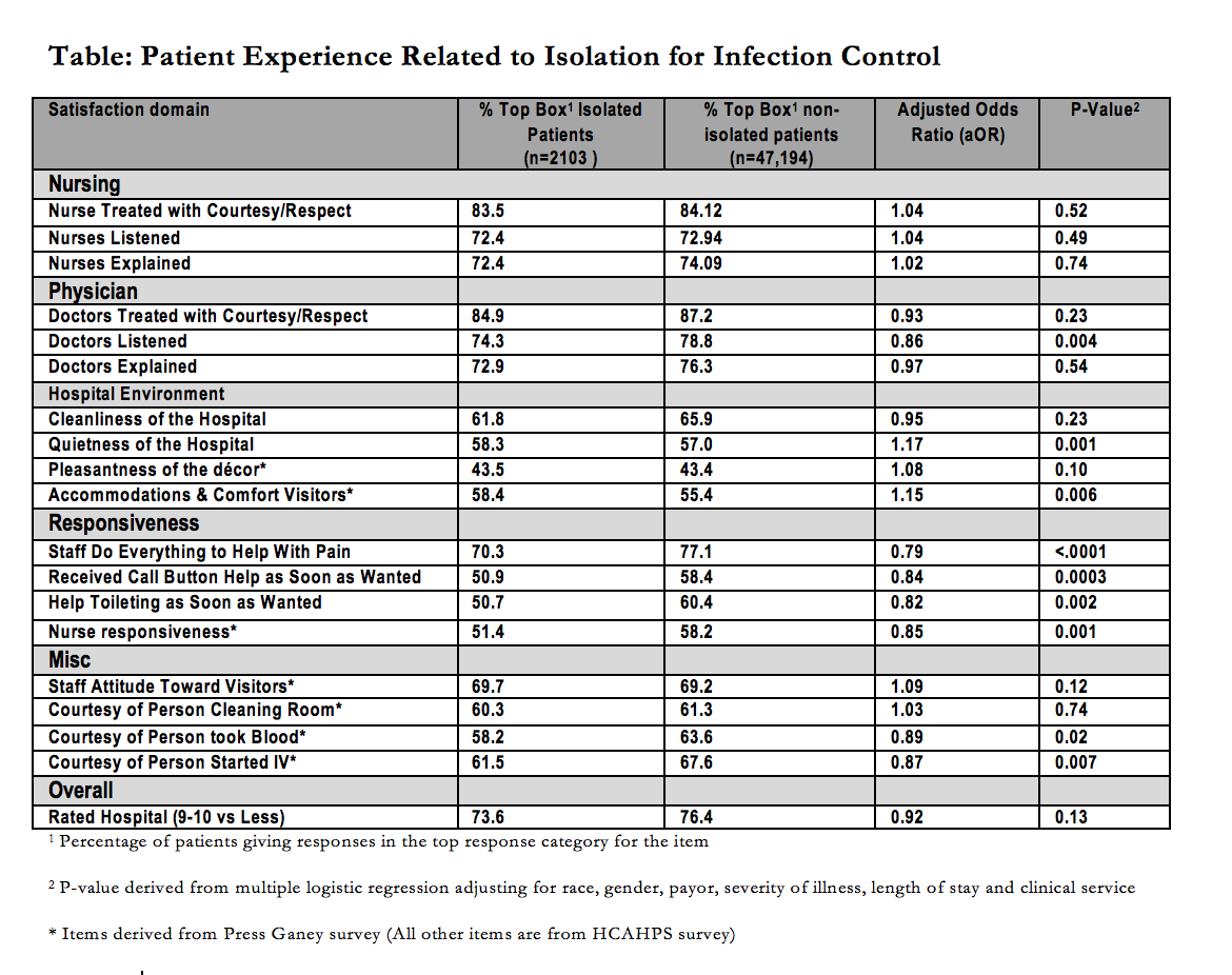 Results: Of 49,297 patients included, 2103 were in isolation. Other than “Doctors Listen Carefully” (aOR 0.86, p=0.004), patient experience with nursing, physicians and overall care was not significantly different between the groups. Isolated patients reported worse experience on several items related to staff responsiveness: pain control aOR 0.79, p<0.0001; call button help aOR 0.84, p=0.002), but better experience with quietness (aOR 1.17, p=0.001) and visitor comfort (aOR 1.15, p=0.006).