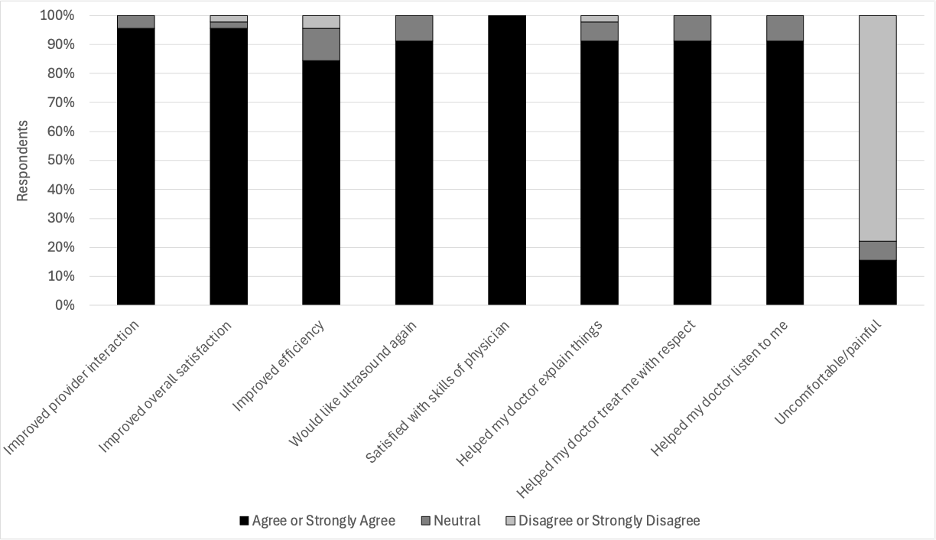 Methods: We conducted a survey of 45 medical inpatients at a single U.S. academic medical center in the Mountain West region who underwent POCUS during their hospitalization. We included patients who had any POCUS exam performed by their attending hospitalist as part of usual medical care. We only considered patients of hospitalists who self-identified as regular POCUS users. The institutional review board approved our study. We excluded patients who were altered or did not speak English. Patients who consented to participate were administered a 10-question survey by a research team member not involved in their clinical care on the same day of their POCUS exam. Survey questions were adapted from validated survey instruments regarding satisfaction with POCUS or HCAHPS survey questions. Responses were collected on a 5-point Likert scale. For this analysis, “strongly agree” and “agree” were grouped, as were “strongly disagree” and “disagree.”