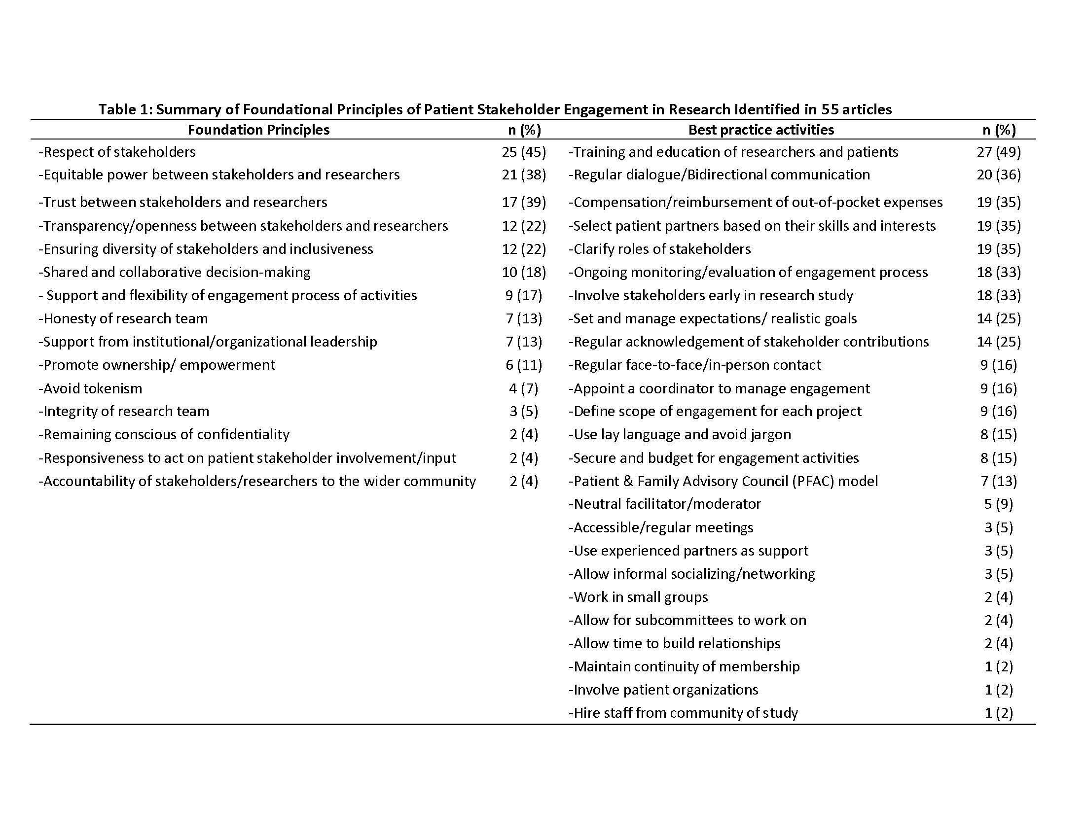 Methods: We conducted a systematic review of the literature supplemented with review of the gray literature to create a narrative review addressing the aims of this study. We first accessed a publicly available repository of systematically identified literature of English-language articles from PubMED/MEDLINE related to patient stakeholder engagement in research. Our second search strategy involved accessing the grey literature reports (e.g. Google Scholar). Two reviewers independently screened articles to determine their relevance. The contents of relevant articles were then reviewed, and data abstracted – specifically domains that were reported as foundational principles of patient stakeholder engagement in research and best activities that support the operationalization of engagement.