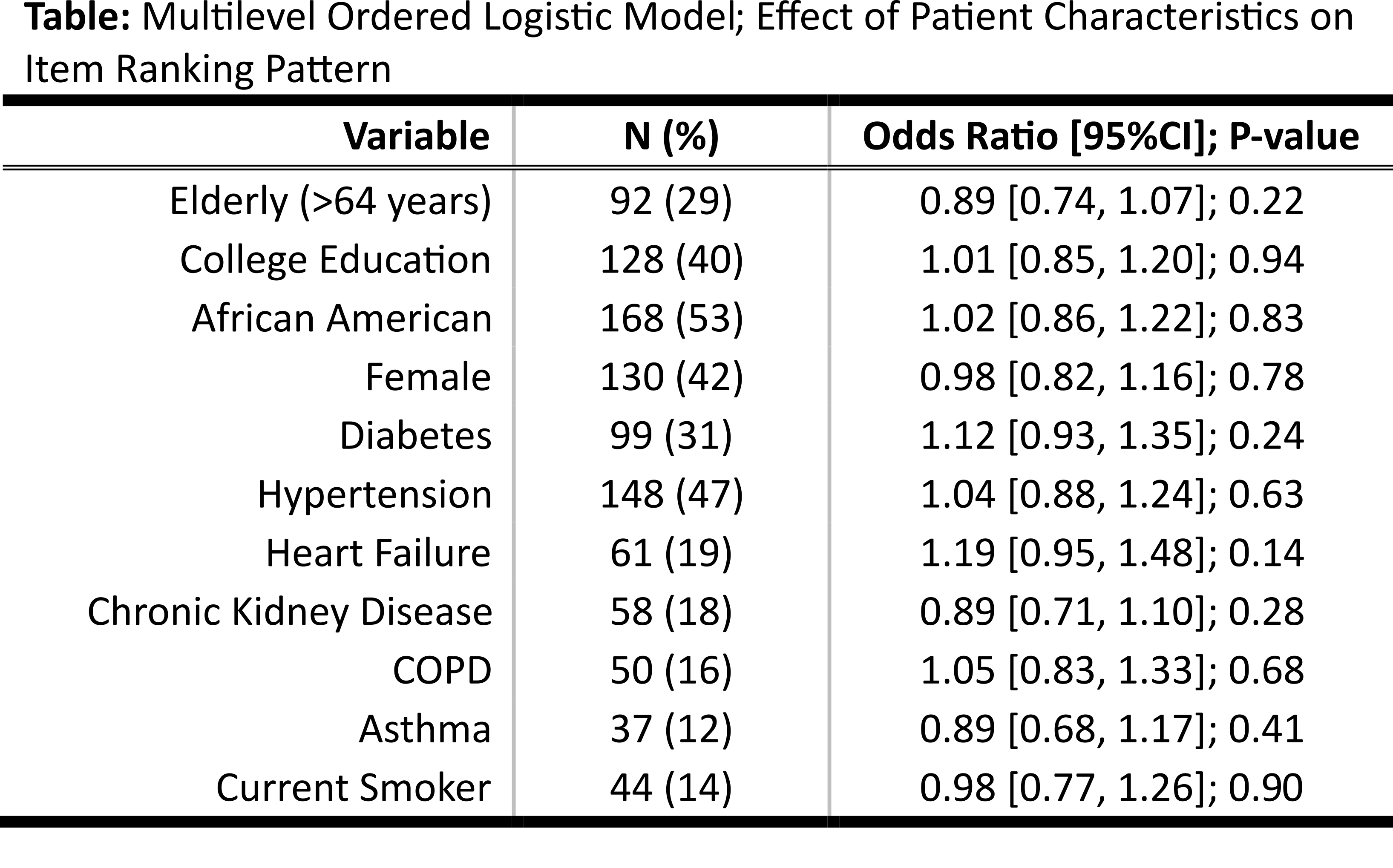 Results: Of the 317 surveyed patients, 179(60%) were males with a mean(SD) age of 56(13) years. The relative worth for patients of discharge medication information was 3 times greater than the dietary/activity restrictions (worth ratio: 3.24; P<0.001). While discharge instructions and hospital course summary also had greater worth than dietary/activity restrictions, follow-up information and when to call 911/doctor had similar worth (Figure). We found statistically significant differences in individual item ranking by participant characteristics; African Americans, heart failure patients, and individuals without college degree ranked information on when to call 911/doctor higher than others (P-value=0.05, 0.04, 0.001 respectively). However, in multilevel ordered logistic models, we did not find any association between ranking and population characteristics (Table).