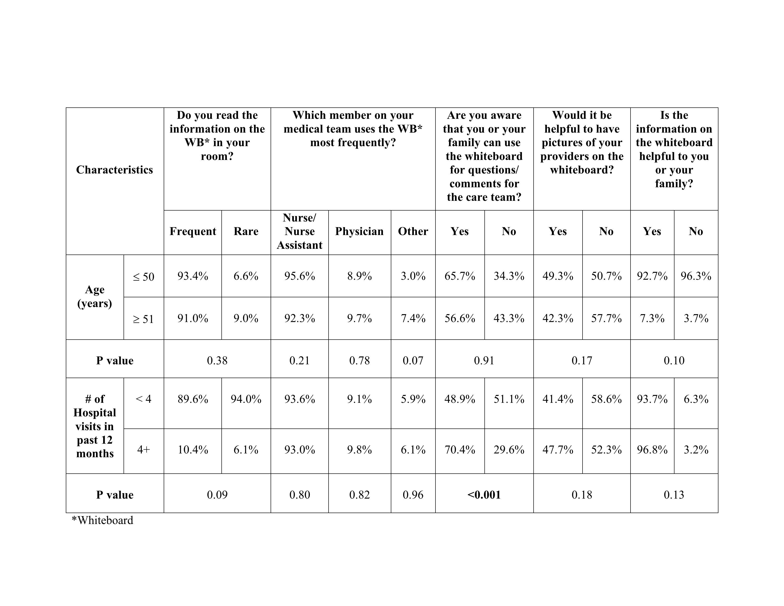 Methods: We conducted a mixed methods study of adult inpatients at a large academic center, along with nursing focus groups. Bedside surveys assessed patients’ views on whiteboards as follows: awareness and purpose of use; utilization by provider type; helpful information on the board; and utility of placing pictures of providers on the board. Data was dichotomized for bivariate comparison based on sex, age 50 or 51 years and average number of hospitalizations in past twelve months of < 4 or 4+. Nursing focus groups were conducted on two inpatient units using a semi-structured guide. Responses were organized into domains represented in the System Engineering Initiative for Patient Safety framework (person, tools, tasks, environment, and organization) to understand health system factors creating barriers to whiteboard use and potential opportunities for improvement.