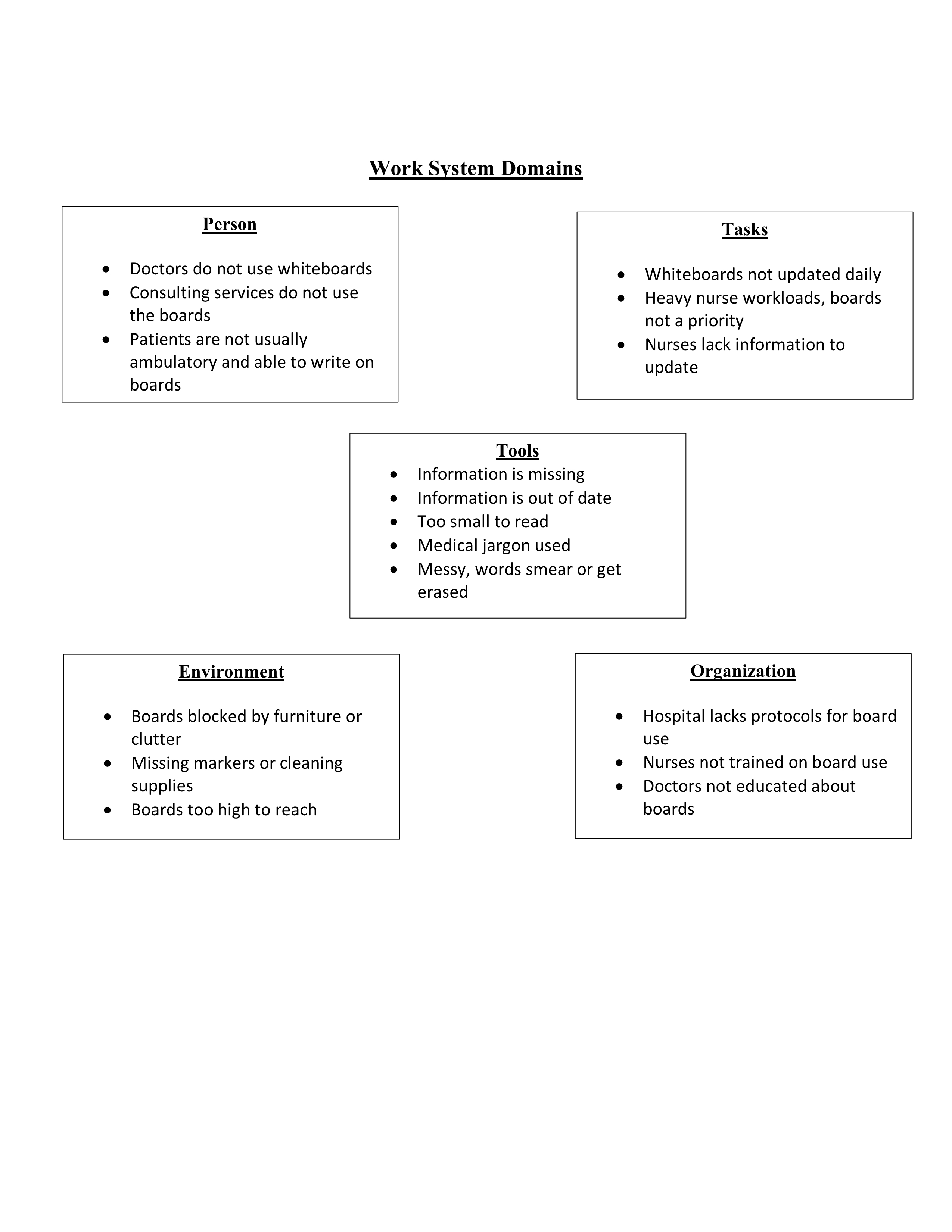 Results: Of the 523 patients approached for interviews, 46 refused to participate and 39 were excluded, thus N= 438 patients. Respondents were more often males (55.05%), 51 years of age (68.7%) and admitted at least once in the past 12 months (50.6%). Over 90% of patients found the whiteboard easy to read and 91.8% read the whiteboard information frequently. The nurse/nurse assistant was identified as the most frequent user of the tool (93.3%) compared to physicians (9.4%). Name of care team members was most helpful (95%), followed by current date (87.3%), upcoming tests/procedures (80.3%) and goals of care (62.9%). 60% of the patients were aware that they could use the whiteboard for questions/comments for the providers and was statistically significant for patients with 4+ admissions in the past 12 months (p < 0.001). Only 55.4% respondents agreed that pictures of providers on the board would be helpful (Table 1.). Of 112 respondents, 19.6% suggested use of notepads/pens or electronic devices with inpatient portals (19.6%). Focus groups participants included 13 nurses, with varying roles from bedside nurses to supervisors. Overall, nurses felt responsible for maintaining the content on the boards. Reported barriers to use, included lack of access to updated clinical information (SEIPS domain for Task) and limited use by doctors and consulting services (SEIPs domain for Person) (Figure 1.). Suggestions to improve utilization included engagement of patients in adding information, questions or patient-centered goals to the whiteboards.