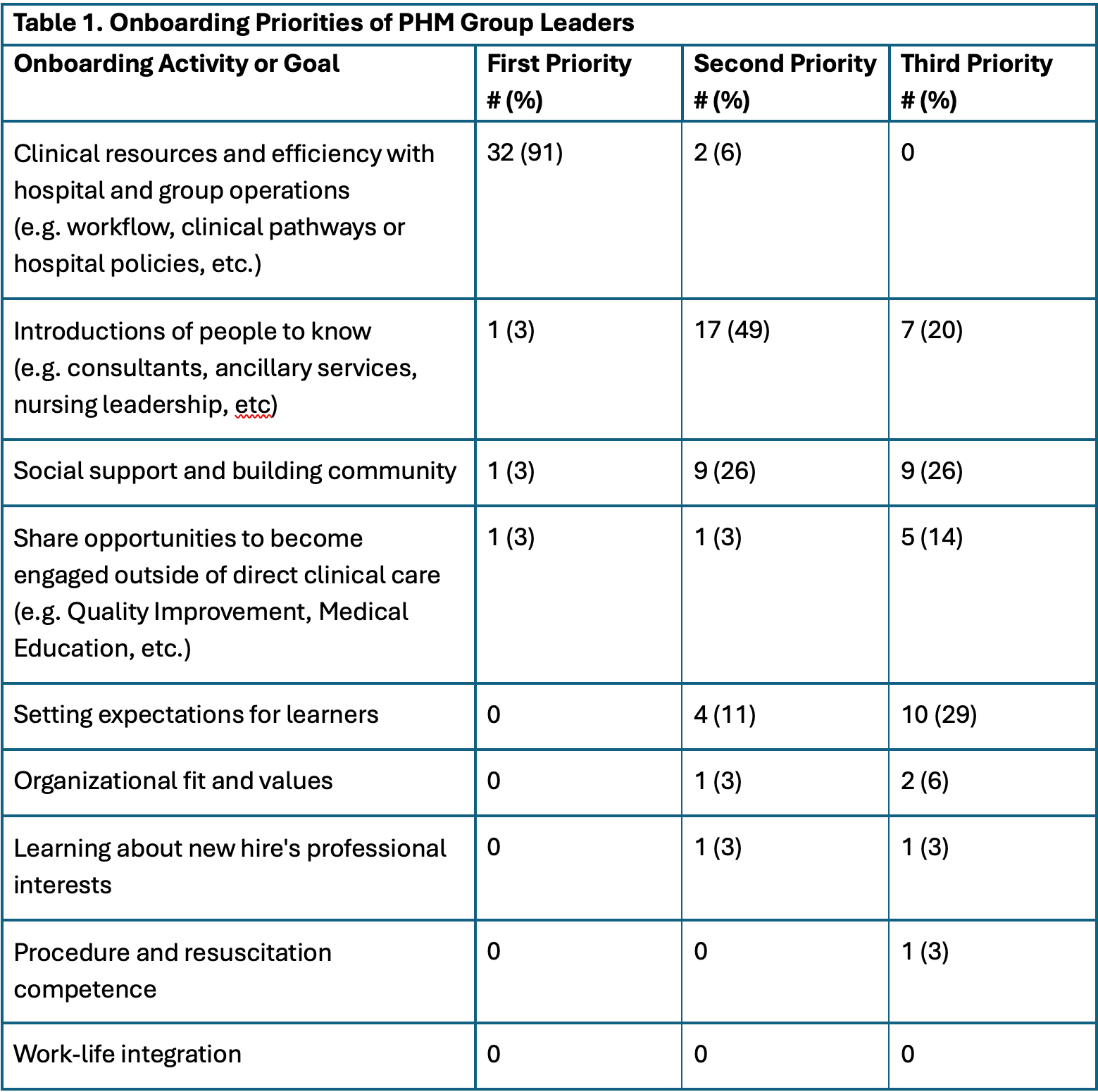 Results: Thirty-five discrete sites completed the survey, and two other sites responded indicating no formal onboarding processes. Respondents worked at a variety of hospitals including freestanding, free-leaning children’s hospitals, and community hospitals. Nearly all respondents felt their onboarding processes were at least somewhat effective, with twelve (34%) describing their onboarding as “very effective” and two (6%) designating their onboarding as “extremely effective.” The two respondents who considered their onboarding “extremely effective” described on-the-job orientation as their top strength, requiring new hires to shadow before their first shift and scheduling new hires to work with “an experienced hospitalist” for their first shifts, thereby allowing “lots of opportunities to see how things work and ask questions” while providing patient care.PHM group leaders were fairly consistent regarding top priorities (Table 1). Nearly all indicated their top priority was orienting new hires to hospital resources for efficiency in their clinical care. “Setting expectations for learners” was the second priority for almost half of respondents. Other top priorities included: social support and community building, introducing people to know, and sharing opportunities to become engaged outside of direct clinical care. Fewer than 10% of respondents selected the following priorities: learning about new hire’s professional interests, organizational fit, procedure resuscitation competence. Interestingly, no one chose work-life integration as one of their top three onboarding priorities.There was a wide range of onboarding activities: all groups included shadowing, numerous respondents emphasized the value of shadowing and pairing new hires with experienced hospitalists for their first shifts; nearly all provided a written onboarding guide. Some groups required activities such as procedure simulation and orientation meetings with designated hospital leaders.
