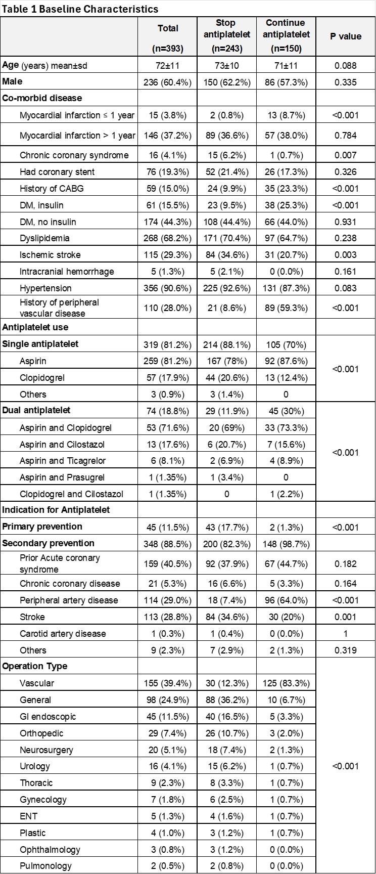 Results: Of 5,091 hospital admissions of patients taking antiplatelet therapy hospitalized for noncardiac surgery/procedure, 393 patients met our criteria. Two hundred and thirty-six (60.4%) were men and the mean age was 72 years. Three hundred and nineteen patients (81.2%) took a single antiplatelet (SAPT) and 17 (18.8%) took DAPT. Three hundred and twenty (81.4%) patients underwent low bleeding risk surgery. Three hundred and forty-eight (88.5%) of the participants took antiplatelet for secondary prevention. The patients were classified into STOP group 243 patients (61.8%) and CON groups 150 patients (38.2%) as shown in Table 1. The median duration of antiplatelet interruption before surgery/procedure was 7 (6,8) days and 0 (0,0) days in the STOP and the CON groups. The median duration of antiplatelet restart after surgery/procedure was 4 (2,7) days and 0 (0,0) days in the STOP and the CON groups. The total duration of antiplatelet interruption was 12 (8.25,15) days and 0 (0,0) days in STOP and CON groups, respectively. The numbers of major adverse cardiac events (MACE), including acute myocardial infarction (AMI), stroke, or cardiovascular death, in the STOP and the CON groups after surgery/procedure: within 15 days were 7 and 1 (2.9% vs 0.7%, P = 0.162); within 30 days were 10 and 1 (4.1% vs 0.7%, P = 0.044), and within 90 days were 12 and 1 (4.9% vs 0.7%, P = 0.021), respectively. The major bleeding events in the STOP and the CON groups after surgery/procedure: within 15 days were 7 and 5 (2.9% vs 3.3%, P=0.80), within 30 days were 9 and 5 (3.7% vs 3.3%, P = 0.044), and within 90 days were 10 and 6 (4.1% vs 4.0%, P = 0.955), respectively as shown in Table 2.