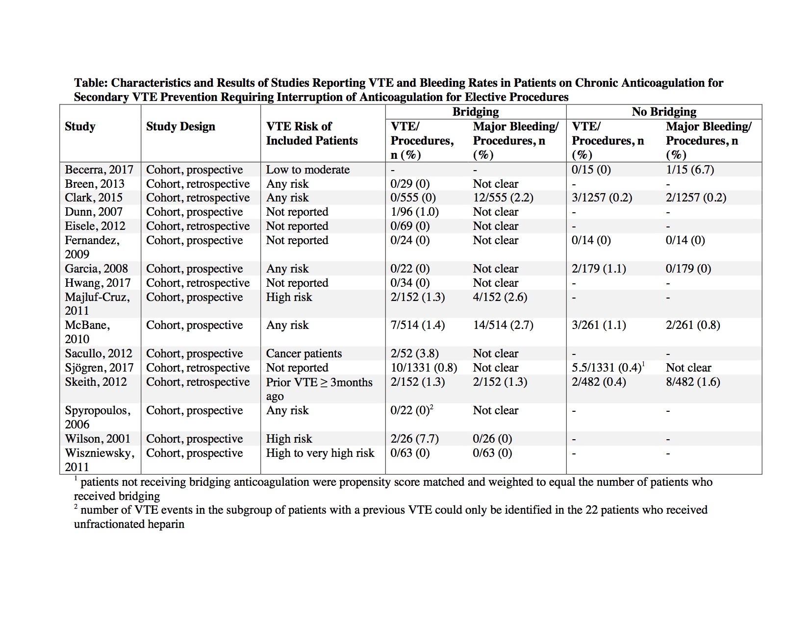 Methods: We performed a systematic review of original articles in the Pubmed and EMBASE databases from inception through September, 2017 to identify studies reporting thrombotic or bleeding outcomes in patients on chronic VKA for secondary VTE prevention who required temporary interruption for an elective procedure. Two reviewers screened titles, abstracts, and appropriate full texts, and abstracted data on study design, patient characteristics, bridging strategies, and rates of recurrent VTE and major bleeding. We then qualitatively synthesized the outcomes of patients receiving periprocedural bridging and those who were not bridged.