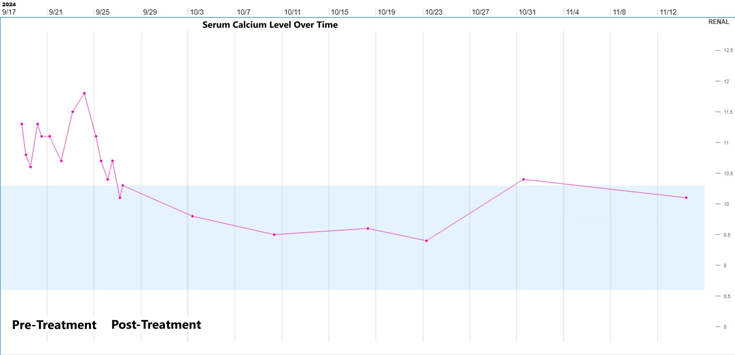 Case Presentation: A 33-year-old man with end-stage renal disease status post renal transplant was readmitted to the hospital with recurrent acute kidney injury (AKI).During his first admission, he reported a few weeks of nonproductive cough, dyspnea, congestion, chills, and recent nausea with vomiting. He was afebrile with normal vital signs and normal SpO2. Respiratory panel was positive for Rhinovirus. Labs showed serum creatinine of 2.6 mg/dL from a baseline of 1.6-1.9 mg/dL, as well as elevated serum calcium of 10.9 mg/dL with a normal serum albumin of 4.5 g/dL. He was treated with IV fluids, supportive measures for Rhinovirus, and his tacrolimus and prednisone were continued at usual doses while his mycophenolate dose was decreased by 50%. Over the two-day hospitalization, his symptoms improved, and his AKI resolved. His serum calcium also improved, to 10.4 mg/dL on the day of discharge. He was readmitted four days later with worsening symptoms, including nausea with vomiting, dyspnea, productive cough, and chills. He was noted to have intermittent temperatures to 99-100 degrees Fahrenheit associated with tachycardia, tachypnea, and an oxygen requirement of 2-3 liters. Chest radiograph showed bilateral interstitial opacities. Labs showed recurrent AKI, normal leukocyte count, and a mildly elevated procalcitonin level; the serum calcium was elevated at 11.3 mg/dL with a normal serum albumin of 4.2 g/dL. He was treated with IV fluids for AKI and hypercalcemia and antibiotics for possible pneumonia, but had persistent symptoms, AKI, and hypercalcemia. Serum PTH was low at 11 pg/mL (ref range 12-88), 25-hydroxyvitamin D (calcidiol) was normal at 35 ng/mL (ref range 13-62), and 1,25-dihydroxyvitamin D (calcitriol) was significantly elevated at 257 pg/mL (ref range 19-79). A Chest CT showed bilateral diffuse ground glass opacities with scattered peri-bronchial nodular consolidations (fig 1). Blood beta-D-glucan was positive, and PCR for pneumocystis jirovecii (PJP) was subsequently positive on induced sputum and bronchoalveolar lavage (BAL) samples. Treatment dose trimethoprim-sulfamethoxazole was started, with resolution of fever, respiratory symptoms, hypoxemia, AKI, and hypercalcemia within 4 days (fig 2), at which point he was discharged. The calcitriol level checked 4 weeks after PJP treatment was normal.