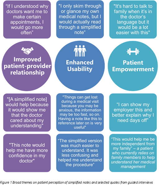 Conclusions: Patients desire access to their medical notes in an accessible format. Guided interviews on simplified medical notes revealed that patients generally perceived plain language medical notes to be desirable and useful.