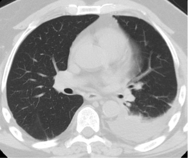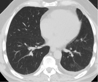 Case Presentation: A 63-year-old male presented to our institution with progressive dyspnea and associated hemoptysis of several days duration. He was a former cigarette smoker, having smoked approximately 1 pack per day for 45 years, who had recently transitioned to using electronic cigarettes, or “vaping,” 3 months prior. With regards to his vaping, he reported using both cannabidiol (CBD) and flavored solutions in attempts to abstain for further cigarette use. He had no recent respiratory illness and no documented history of malignancy, pulmonary embolism, COPD or other lung disorders. On admission, he was afebrile, oxygenating well and with stable hemodynamics. There was no leukocytosis and initial infectious work up was negative. Chest radiograph revealed a new left-sided pleural effusion. Subsequent CT angiogram of the chest and pulmonary arteries was without pulmonary embolism but confirmed the presence of the left-sided effusion. He underwent thoracentesis with the removal of 700 mL of serous fluid. Pleural studies were consistent with an exudative effusion by Light’s criteria. Cytology was negative for malignant cells. Repeat CT of the chest revealed an 8 mm pleural-based thickening on the right but no findings on the left. He was evaluated by pulmonology who recommended repeat CT imaging in 4 weeks and discontinuation of further electronic cigarette use. The patient felt significantly improved and repeat CT of the chest following abstinence from further vaping was without re-accumulation of the left-sided effusion. The pleural thickening noted on the right side appeared stable with no progression on repeat imaging.