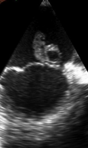 Case Presentation: A 30 year-old female presented postpartum day 1 following a normal vaginal delivery from an outside hospital after chest CT angiography (CTA) identified a 2.5 cm pericardial effusion. Review of systems was positive for dry cough, left sided chest pain, dyspnea on exertion, recent post-partum abdominal pain, chills, and diaphoresis. On arrival to the medicine floor, she was afebrile, BP: 140/83 without pulsus paradoxus, HR 100 bpm, RR 20, and normal O2 saturation on room air. Physical exam revealed rales at the lung bases, bilateral pedal edema, and JVD to angle of the mandible. Labs were significant for a WBC 22,700, procalcitonin of 1.78, ESR 52, CRP 128, BNP of 587, and troponin peak of 0.110. EKG showed no ST changes and was without electrical alternans. On initial evaluation, a bedside Point of Care Ultrasound (POCUS) exam of the heart was performed, which was concerning for ~2 cm vegetation on the mitral valve (POCUS Mitral Vegetation Image). As a result, the patient was immediately started on empiric vancomycin and piperacillin-tazobactam due to concern for sepsis from infective endocarditis (IE). A formal TTE performed the following morning confirmed a vegetative mass measuring 2.2 cm x 1.5 cm on the anterior leaflet of the mitral valve with mitral regurgitation, dilated left atrium, and pericardial effusion. TEE further confirmed the presence of a large vegetative mass with multiple echolucencies suggestive of valvular abscess (TEE Mitral Vegetation Image) . Blood cultures came back positive for Streptococcus mitis/oralis . Cardiothoracic Surgery was consulted and performed an immediate mitral valve repair with abscess extraction. She was discharged home with 6 weeks of IV ceftriaxone and follow up with Infectious Disease. It is important to note, the baby was also tested and luckily the blood cultures remained negative at > 5 days.