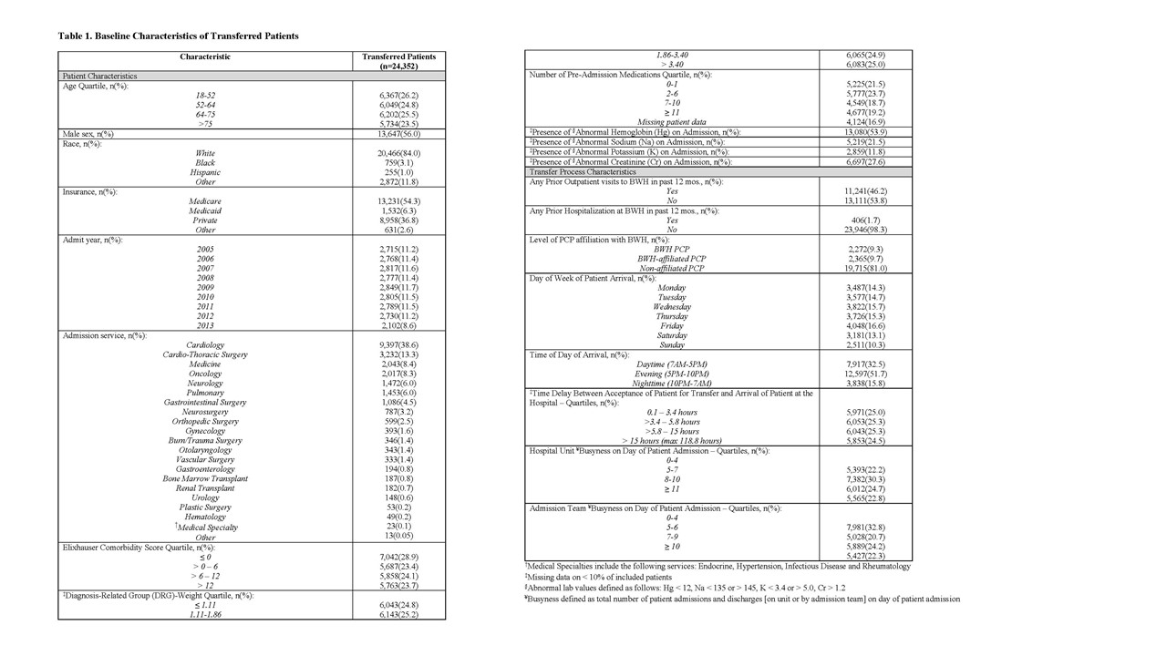 Methods: We performed a retrospective analysis of patients ≥ age 18 transferred to Brigham and Women’s Hospital (BWH), a 740-bed tertiary care hospital, from another acute care hospital between January, 2005 and September, 2013. Examined outcomes included transfer to the intensive care unit (ICU) within 48 hours of admission, and 3-day, in-hospital, and 30-day mortality from index admission. Potential predictors included any prior association with BWH (defined as prior outpatient visit, hospitalization or PCP affiliated with BWH), day of week of patient transfer, time of day of patient arrival, time delay between acceptance for transfer and arrival at BWH, and hospital unit and admission team busyness (admissions and discharges) on day of patient arrival. Covariates for adjustment included admission year and service, patient demographics, comorbidity, illness severity, number of preadmission medications, and selected abnormal laboratory values on admission. All data was obtained from administrative sources. We used descriptive statistics to determine baseline characteristics, and performed a series of multivariate logistic regression models to obtain the adjusted effect of each predictor on each outcome, adjusting for all other variables.