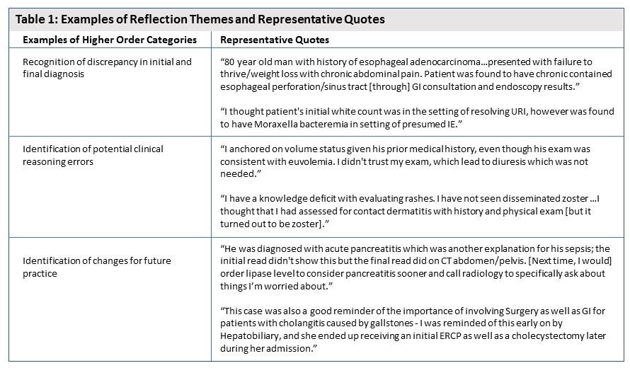 Between January-August 2017, 68 of 82 eligible residents (83%) completed 248 structured reflections worksheets, and 78% of residents solicited feedback. We analyzed the reflection worksheets to assess the content of reflections. Several themes emerged from our analysis. Residents recognized discrepancies in initial and final diagnoses. They also identified changes they might make in their future clinical practice and heuristics that affected their diagnostic reasoning (Table 1). 28% of residents reported seeking feedback “most of the time” or “always” from the receiving day team before the intervention. After the intervention, 58% of residents reported intending to seek feedback. 70% of the residents surveyed found the intervention valuable for their professional development.