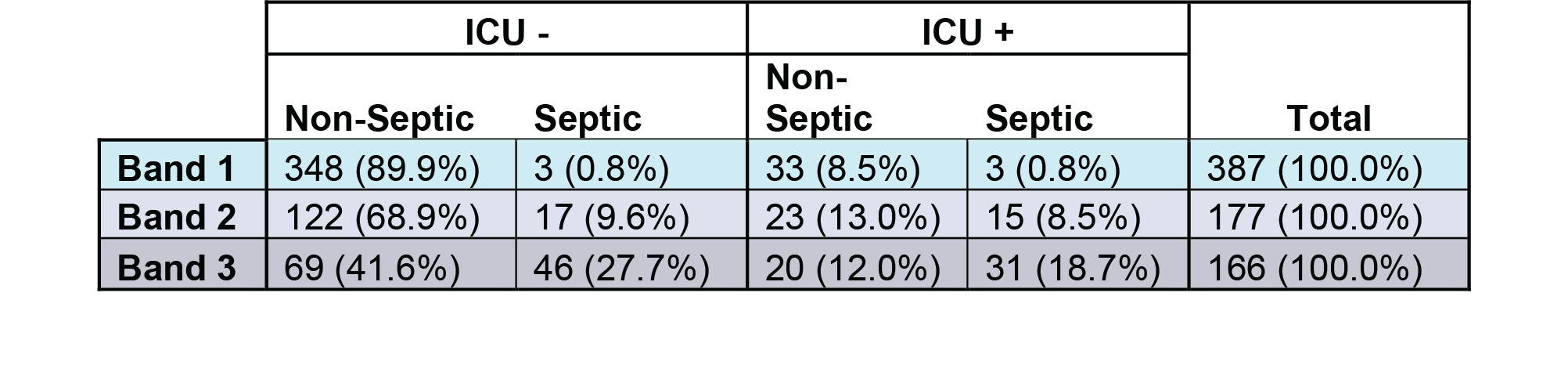 Methods: A semi-quantitative in-vitro HR test uses deformability cytometry to assess leukocyte biophysical properties from whole blood in < 10 min. The test generates an Index (0.1 - 10.0), stratified into 3 interpretation bands (Band 1, Band 2, Band 3) of increasing sepsis likelihood[4].Adult patients presenting to the ED with signs or suspicion of infection were prospectively enrolled at multiple US sites (02/2016–10/2021). EDTA-anticoagulated blood was assayed within 5 hours from draw using the test, and patients were followed by retrospective chart review. Infection and sepsis status were determined via retrospective physician adjudication per Sepsis-3 criteria. Necessity for ICU care (ICU -/+) was determined through objective cardiovascular (MAP < 60 or SOFA-CV ≥2), respiratory (PF ratio < 200), or renal ([Creatinine > 5 and (HCO3- < 12 or K+ > 6)] or BUN > 120) criteria within 3-days of presentation. Missing data was not imputed.