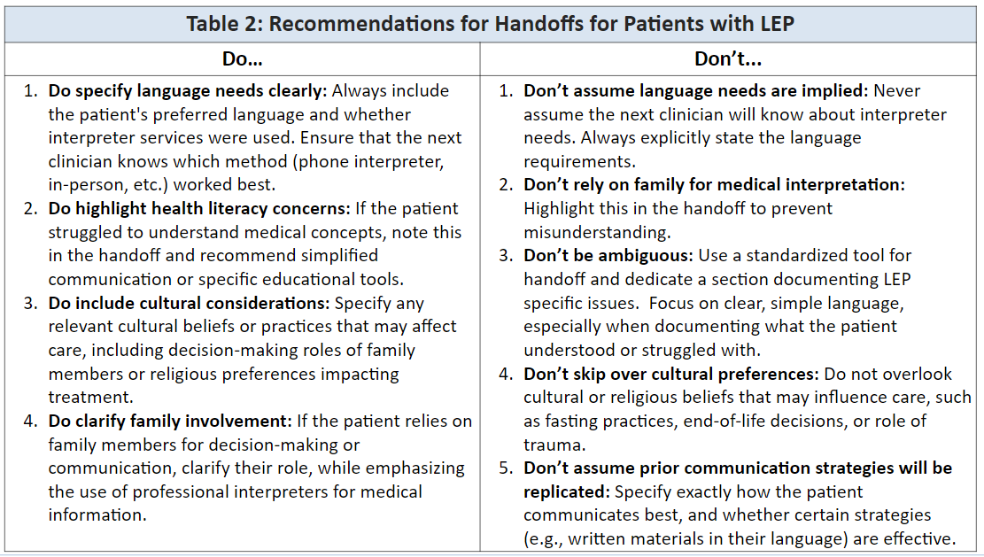 Background: Handoffs are critical for conveying essential information about the patient’s care, yet they often lack structure and completeness, which increases the risk of adverse events and medical errors. Patients with LEP are especially vulnerable due to communication barriers, which can exacerbate disparities in care quality and outcomes. Despite the rising number of patients with LEP, there is limited research addressing the challenges of handoffs for this population. The objective of this study was to identify gaps and opportunities for improvement in handoffs of patients with LEP, focusing on developing best practices to enhance safety and care quality.