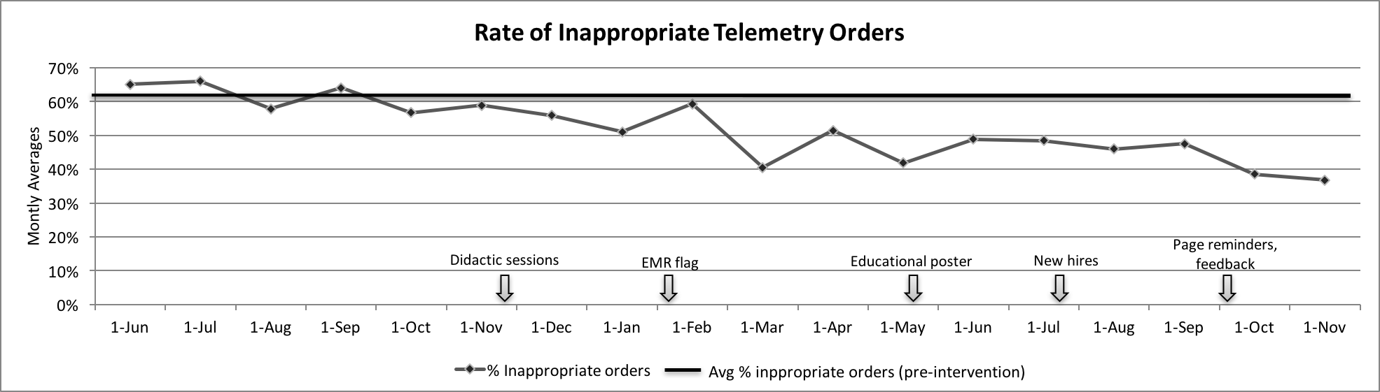 Conclusions: Inappropriate telemetry use among hospitalist providers at a large academic center can be reduced with an aggressive multimodal campaign utilizing high-yield educational materials, an EMR silent indicator, and page reminders. However, sustainability may be difficult with the yearly flux of new providers and requires motivated personnel to track and maintain section awareness of telemetry utilization.