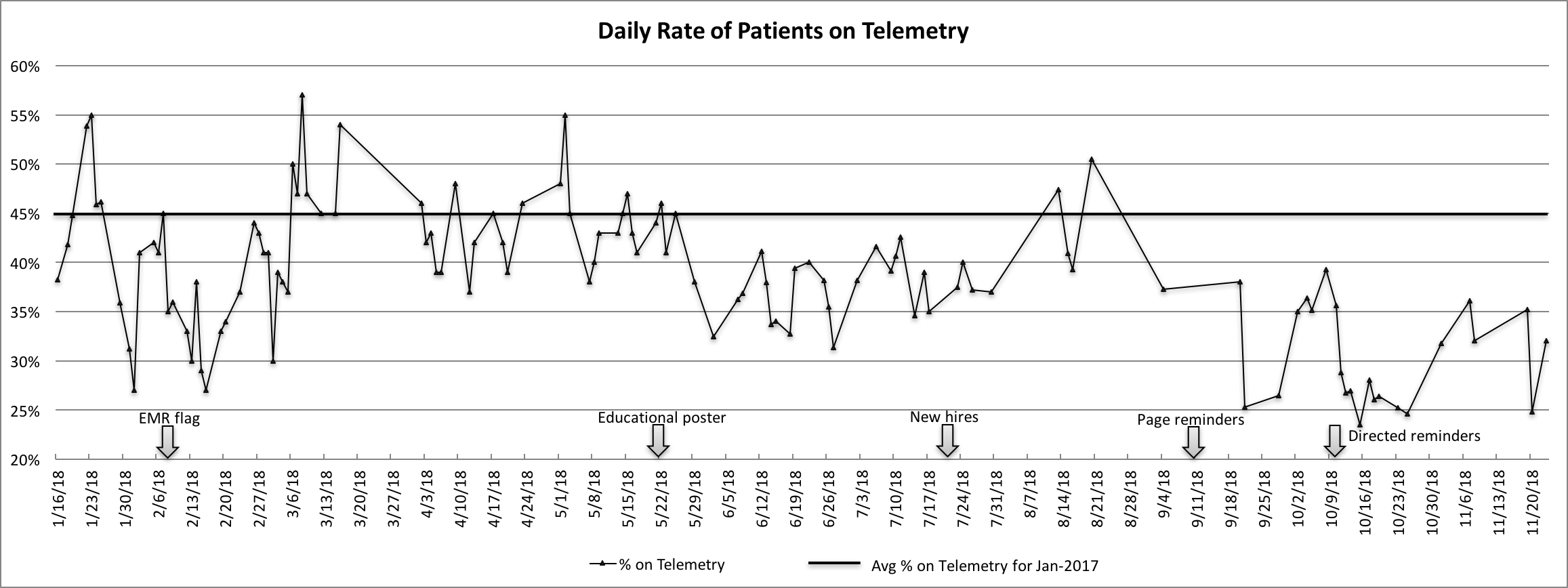 Methods: We instituted a multimodal campaign to reduce inappropriate telemetry use within the non-teaching hospitalist services at a large urban academic hospital. The sequential interventions included didactic sessions, educational posters, utilization of a pre-existing electronic health record (EHR) silent indicator, and reminder pages. We retrospectively reviewed telemetry orders placed by hospitalist providers during the pre-intervention period (Jun – Nov 2017), intervention period (Dec 2017 – Nov 2018), and last 6 months of intervention (Jun – Nov 2018). We also prospectively monitored daily telemetry use from January to November 2018, with intermittent sampling.