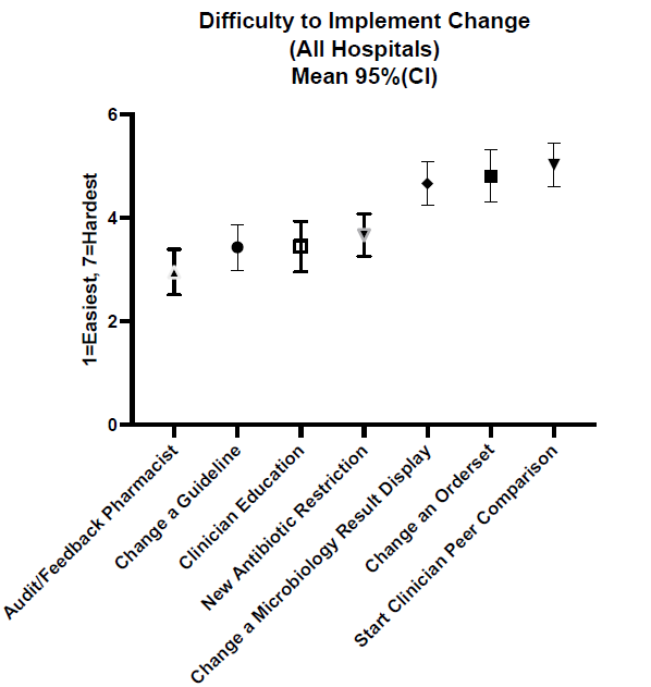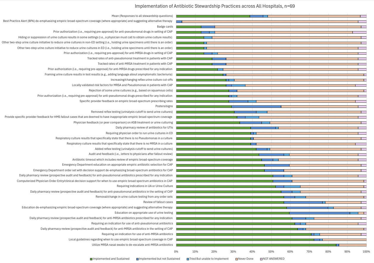 Conclusions: Self-reported feasibility and implementation of antibiotic stewardship interventions varied widely across hospitals. However, once implemented, stewardship interventions were largely sustained—particularly those favoring technical (i.e., change in technology or process) over adaptive (i.e., require cultural adjustments) solutions. Hospital size influenced implementation for 5 of the 43 interventions. Small hospitals reported significantly higher rates of some antibiotic stewardship interventions potentially due to smaller patient populations and fewer administrative barriers to modifying existing practices. Hospitals should consider their local context, intervention feasibility and the potential for intervention sustainability when deciding on implementation priorities in stewardship.