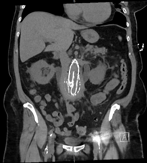 Case 2: A 70 year old male presented in November 2017 after being found to have acute abnormalities in his lab work found by Nephrology as an outpatient. He follows with Nephrology and Urology since having been diagnosed with retroperitoneal fibrosis and had bilateral ureteral stents placed. The patient’s Creatinine level was found to be 8.26mg/dL, with baseline around 3.0mg/dL. In the Emergency Room he was acidotic with a bicarbonate level of 13mmol/L, other lab results included a BUN level of 144mg/dL, Potassium level at 5.3mmol/L, Magnesium level of 1.0mg/dL. A bicarbonate drip was started. Nephrology and Urology were called and tried placing ureteral stents, but failed due to fibrotic tissue surrounding the ureters. Bilateral nephrostomy tubes were placed, and patient’s renal function initially started to improve, but started to decline again. He started showing signs of uremic encephalopathy, so a permacath was placed and he started hemodialysis. His renal function improved significantly. This patient was diagnosed with retroperitoneal fibrosis about three months status-post his EVAR.