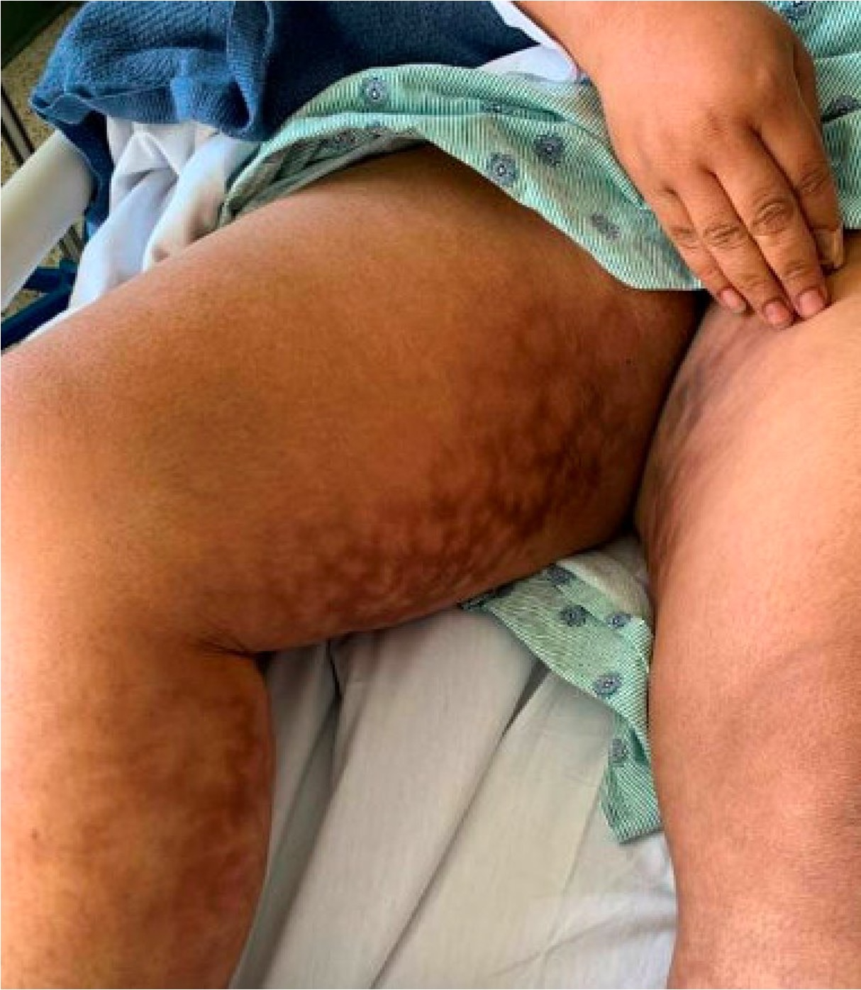 Case Presentation: A 37-year-old woman with no known past medical history presented with several weeks’ history of worsening crampy pain in her legs; she reported taking nonsteroidal anti-inflammatory drugs for pain with little relief. She had also noticed discoloration and a lacy rash, particularly around her calves and moving upward toward her inner legs. She reported feeling cold in her legs, further contributing to her discomfort, along with increased fatigue, lightheadedness, and dyspnea on exertion during this time. On presentation, her vitals were temperature 36.4 °C, heart rate 101, blood pressure 125/77 mm Hg, and her oxygen saturation was 100% on room air. She denied any signs of bleeding and reported normal menstrual cycles. Labs were significant for hemoglobin of 6.8 gm/dL. An extended anemia panel revealed iron of 32 mcg/dL, ferritin of 3 ng/mL, and an iron saturation level of 7%, suggesting iron deficiency anemia. On exam, she had extensive mottling of skin with hyperpigmented changes involving bilateral lower extremities involving calves and inner and back of thighs. She was admitted and transfused 1 unit of packed red blood cells and hemoglobin with appropriate response. For the lower extremity rash, we were concerned about livedo reticularis and consulted dermatology. Upon further history obtained by dermatology, the patient revealed that due to her legs feeling cold and cramping, she has been placing a space heater with direct exposure of her skin in between her legs for several hours a day on a daily basis for the past few months. Due to this history of routine, prolonged, direct heat to the inner thighs and a clinical finding of fixed, brown retiform patches and thin plaques isolated to the area, the diagnosis was thought to be consistent with erythema ab igne. The treatment recommended by dermatology was to avoid ongoing heat exposure.