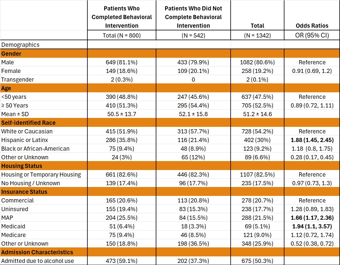 Results: From 9/2022 to 9/2024, 27,914 patients were admitted. 18,146 (65%) were screened with the AUDIT-PC, with 1085 (6.0%) screening positive. SUNs identified 257 additional patients with UAU through referral methods.Of these 1342 patients, 81% were men, and mean age was 51 years. 54% were Caucasian, 30% were Hispanic / Latinx, and 9% were Black. 17% were unhoused, 18% were uninsured, and 21.5% were covered by a county-based medical assistance program (MAP).Of these 1342, 800 (59.6%) patients engaged in and received the intervention. The mean AUDIT score was 15, and 473 / 800 patients (59%) were admitted to the hospital due to consequences of alcohol use. Those who engaged in the intervention were more likely to be Hispanic / Latinx (OR: 1.88, 95% CI: 1.45-2.45), and have MAP or Medicaid (OR: 1.66, 95% CI 1.17-2.36; OR: 1.94, 95% CI 1.1-3.57).In addition, for the 489 (61%) patients with AUDIT ≥12, 273 (56%) were eligible and interested in MAUD, and 248 were started on medication before discharge. The SUNs placed primary care referrals for 315 (64%) patients. We completed follow-up phone calls for 149 (30%) patients with AUDIT≥12, and 124 (83.2%) completed a repeat AUDIT. Mean reduction in AUDIT was 13.8 points (95% CI: -15.4, -12.2). 36 patients had stopped drinking entirely. Outpatient chart reviews were completed for an additional 164 patients (33.5%). Of the 313 patients with follow-up data, 163 (52.1%) attended their follow-up appointment, and 76 (24.3%) reported adherence to MAUD.For the 489 patients with AUDIT≥12, inpatient chart review showed 128 (26%) patients had a return hospital encounter (emergency room visit or readmission) within 30 days of discharge. Nearly 60% of these encounters were due to continued alcohol use. Patients with a return hospital encounter were more likely to be >50 years of age (OR: 1.78, 95% CI:1.18–2.68), unhoused (OR: 4.84, 95% CI: 3-7.88), and have Medicaid or MAP (OR: 4.48, 95% CI: 2.05-11.55; OR: 3.47, 95% CI: 1.91-6.62). Patients with a return encounter also had smaller reductions in AUDIT score than those who did not have return encounters, with mean reduction of -9.0 vs -16.1 points (difference 7.0, 95% CI: 3.1-11.0). There were no major differences in initial AUDIT score or MAUD initiation between patients with and without a return encounter.