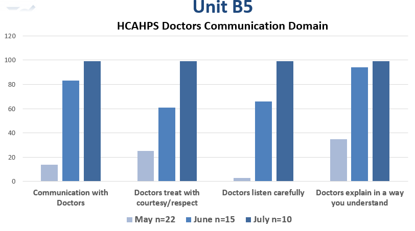 Results: Based on the preliminary data of the first two months of the study, we have seen significant results with our approach. The results are as follows in each domain of the HCAHPS survey (as shown in the image):1. “Communication with Doctors,” the HCAHPS score improved from a 14% percentile rank in May 2022 to 83% in June and 99% in July. 2. “Doctors treat with courtesy/respect,” the score improved from a 25% percentile to 61% in June and 99% in July. 3. “Doctors listen carefully to you,” the score improved significantly from the 3% percentile to 66% in June and 99% in July. 4. “Doctors explain in a way you understand,” the score increased from 35% percentile to 94% in June and 99% in July. Conversely, the remainder of Medicine inpatient units failed to show an increase in HCAHPS scores in the domains mentioned above.
