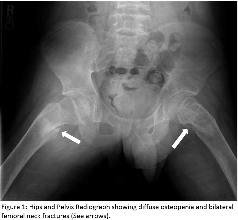 Case Presentation: A 14-year-old male presented to an emergency department with 6 days of left thigh pain and inability to bear weight following a fall from bed. Associated symptoms included nausea, diaphoresis and weakness. Review of systems revealed pallor, easy bruising and yellow eyes. history was negative except for developmental delay, described as auditory processing issues. He had no prior hospitalizations or significant family history. Physical examination showed normal vital signs and growth parameters, poor dentition, mild scleral icterus, pallor and a I/VI systolic ejection murmur. Liver was palpable 2 cm below the costal margin. The left lower extremity (LE) was externally rotated and flexed at the hip. Both LEs had limited range of motion at the hip due to pain. Tenderness to palpation of the left thigh was noted. Exam was otherwise normal. Initial workup revealed normocytic anemia and mild hyperbilirubinemia (Table 1). Left femur, pelvis and bilateral hip x-ray showed bilateral femoral neck fractures and diffuse osteopenia, suggestive of metabolic or infiltrative disorder (Figure 1). MRI Pelvis showed bilateral femoral fractures, abnormal enhancement of hip and thigh muscles, and hip joint synovium. Leading differential at this time included malignancy or infectious process. Further labs demonstrated elevated inflammatory markers, but normal lactate dehydrogenase (LDH), uric acid, peripheral smear, haptoglobin and red blood cell studies. Parathyroid hormone was elevated and vitamin D was low.