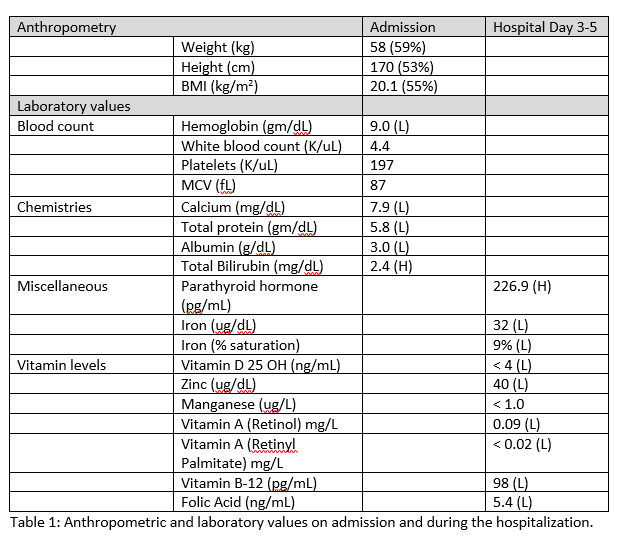 During admission, patient’s oral intake was poor, prompting discussion of diet. Mother reported a long history of food refusal; home diet consisted of cola, fish sandwiches and chips. Suspicion for multiple nutritional deficiencies (ND) led to additional labs confirming deficiencies of iron, folic acid, vitamin B12, zinc and vitamin A. Supplemental formula feeds, vitamins and nutritional counseling were started; G-tube was placed. Discharge occurred once feeds were tolerated. Repeat labs at 2 months showed normalization of all labs and vitamin levels.