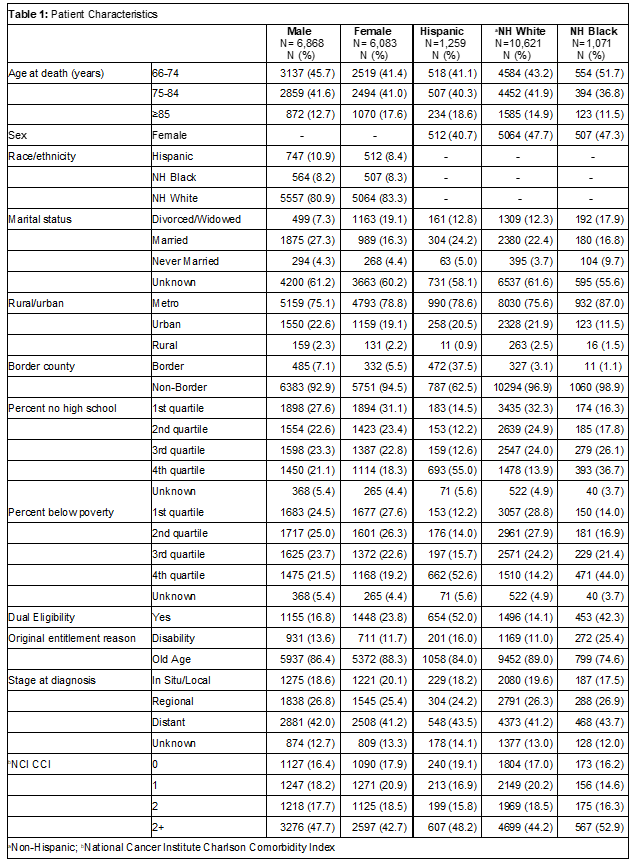 Conclusions: Among Texan Medicare lung cancer decedents, we found that males, non-Hispanic Black and Hispanic decedents had greater healthcare utilization and less use of hospice in the last 30 days of life. These differences could be due to a variety of factors including cultural preferences and availability and access to quality hospice and other services among others. ACP rates were low across all groups, possibly marking an important opportunity for providers to address patient priorities and assure provision of patient-centered care at the end-of-life.