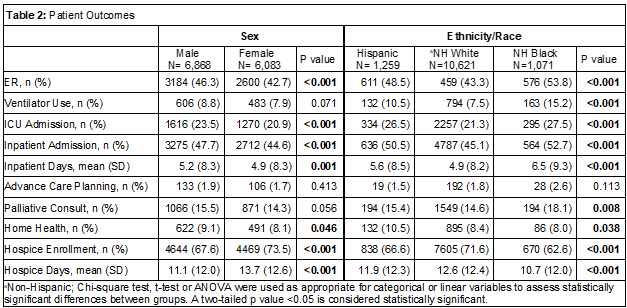 Methods: We analyzed Texas Cancer Registry linked with Medicare data for patients aged 66 years and older who died 6 months to 5 years after receiving a diagnosis of primary lung cancer from 2010-2018. Patient characteristics including age at death, original entitlement reason and stage at diagnosis are reported as frequency (proportion) or mean (standard deviation (SD)). Chi-square test, t-test or ANOVA were used as appropriate for categorical or linear variables to assess statistically significant differences in healthcare utilization, ACP and downstream outcomes between groups in the last 30 days of life. Multivariable logistic regression models were used to assess sex, ethnic and racial differences in odds of inpatient admission or hospice enrollment in the last 30 days of life.