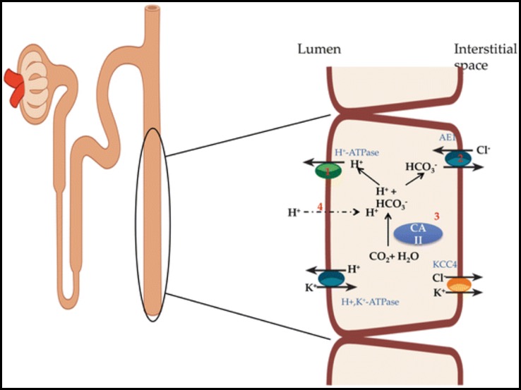 Distal renal tubular acidosis results from abnormalities with acid excretion in the intercalated cells of the distal collecting tubule. Hypokalemia results when lumenal potassium cannot be reabsorbed due to defective H-K ATPase transporter.