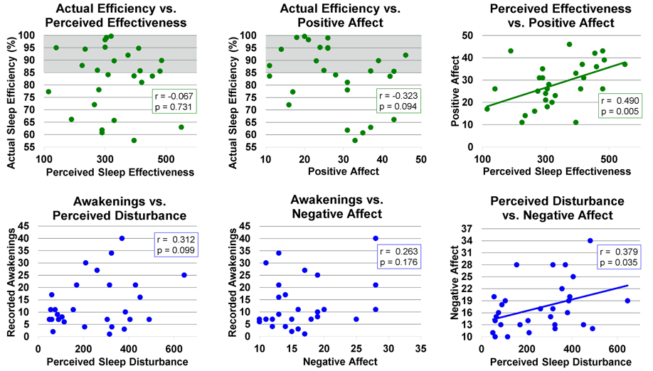 Results: Thirteen patients completed the study with a total of 29 patient nights. Patients were on average 64.7 years old and the majority were female. Other patient demographics are in Table 1. There was no significant relationship identified between perceived and actual sleep efficiency or sleep disturbances (Figure 1). Additionally, perceived sleep time and actual sleep time were not significantly correlated. Actual sleep time, efficiency and awakenings as measured by the ActiGraph were not correlated with positive or negative affect. Actual sleep measures were not associated with daily affect. Perceived sleep measures did correlate with daily mood (Figure 1). Patients who perceived their sleep to be more effective were more negative and patients who perceived more disturbances in their sleep were more negative.