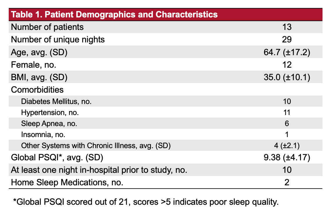 Conclusions: Perceived sleep measures and actual sleep measures were not associated in this study population. However, daily affect was associated with perceived sleep measures but not actual sleep measures. There is cause to be skeptical with self-reported measures of sleep in the inpatient setting. These self-reported measures could be related to confounding factors, such as daily affect. Studies employing objective measures of sleep are needed to better understand any potential relationships between sleep and clinical outcomes.